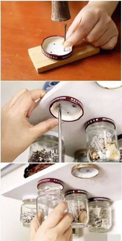 这种悬放法其实很好实现,只需在瓶盖上打孔,用钉子将它们钉在木板上,再把瓶子和瓶盖拧紧就可以了。待到要用时,轻松拧开取下瓶子,超nice~
