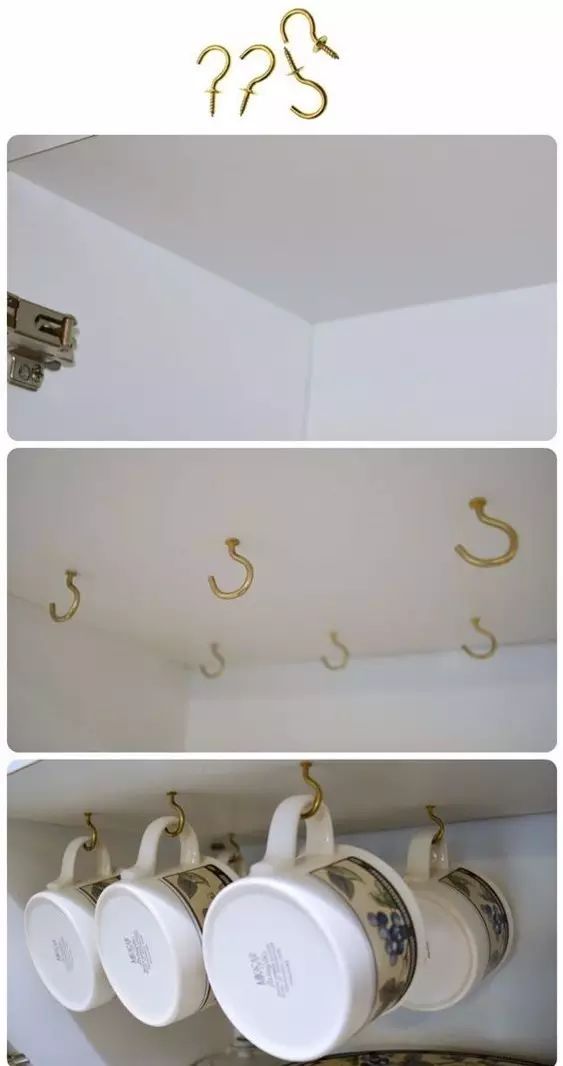 将这种螺丝挂钩钉在橱柜里面的隔板上,隔板最好厚度适当,以免打穿,订好后杯子就有去处了~