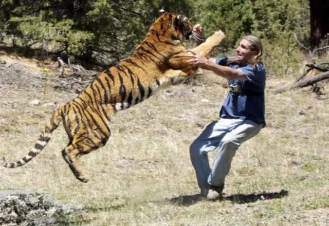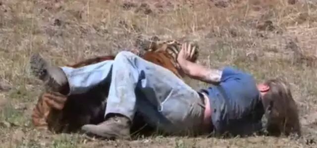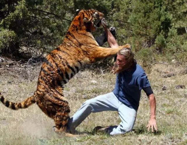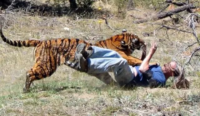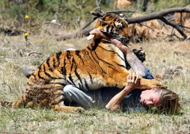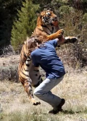 可惜,約翰最終還是沒能敵過這頭凶猛的老虎,老虎鋒利的牙齒咬住了他的脖子。此時,增援的人員尚未到來,而3位愚蠢的馴獸師在慌忙中,居然忘記了使用麻醉槍,其中一位馴獸師更是被老虎的發狂行為嚇愣了。