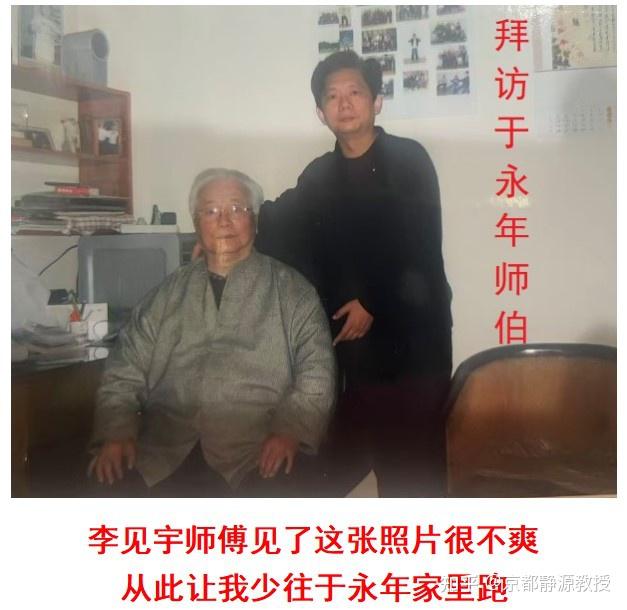 第二,只有意拳门内的深度知情者才知道:于永年师伯和李见宇师傅两个人长期不和!不和到什么程度?相互从不同时到场和见面:于到李不到、李到于不到。他们两个人从上个世纪40年代晚期,即1948年春开始,就相互不来往、不说话、不共事。李见宇师傅明确警告我:“没事少往于永年那里跑”。见我拜访于永年师伯时的留影,如下: