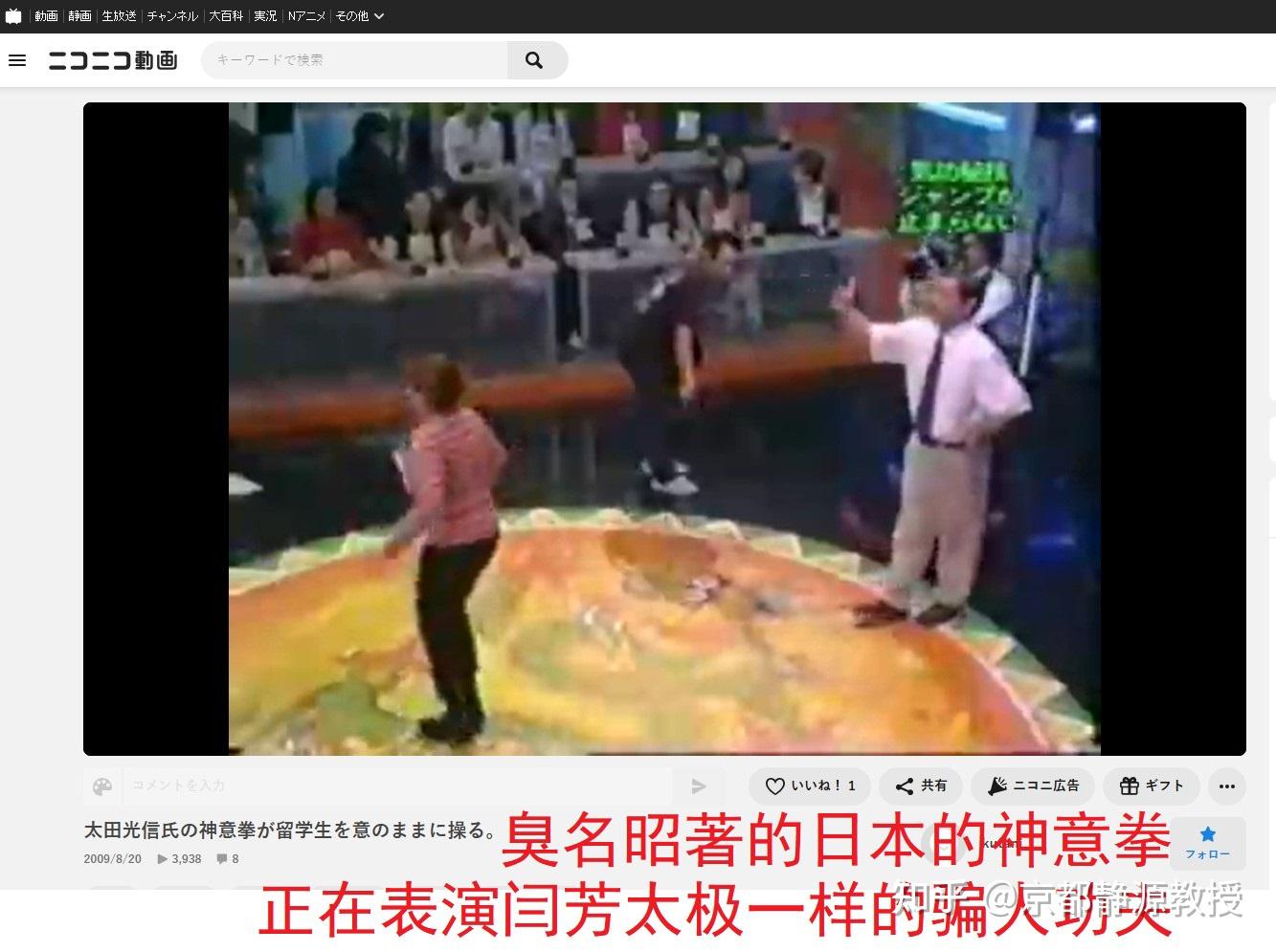 我从不承认有什么“神意拳”。因为日本很早就存在“神意拳”这个名称,而其实际功夫和中国的“闫芳太极”百分之百一样。因此我多次劝说过姜正坤师傅(他使用“神拳”之名)和李见宇师傅(他使用“神意养生拳”之名),用来说明咱们祖师爷创造的意拳养生功法和气功修炼的那种“神意以求之”的逍遥境界。尤其是日本的“神意拳”因为诈骗弟子和学生钱财、大搞男女性的双修等出格行为早就臭遍半条街了。因此,李见宇师傅在他开始施行他的挽回被骗18万元损失的“接盘侠计划”之前,也一直使用“神意养生拳”之名。请见日本“神意拳”宗师太田光信正在单手隔空发功、让弟子们自动跳大神的视频截图: