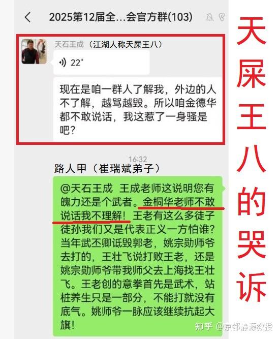 第三,也是最为核心和关键的就是石墨从未被李见宇师傅接纳为正式弟子,也没有拜师过李见宇师傅,当然更不存在拜师仪式和拜师见证人。全部都是石墨他个人在李见宇师傅死后肆意胡说而已。传统武学最看重这点!这是师徒传承的核心纽带,是武术界的遗传DNA。因为石墨只是个学生,全部学习次数不到10次,最长一次是将近四个小时,仅此而已。因为他心中有鬼,所以他才发明了一个所谓的“师生制传承”。可是他对自己招收的弟子的全部做法却是百分之百的传统的拜师制:递贴、记名、交纳红包、下跪礼、见证人等等,无不具有!甚至还约请了“于永年先生早期弟子北京著名拳家杜吉星老师、吴振法先生早期弟子河北保定著名拳家由振忠老师,作为首期记名学生的见证人,应邀出席了认师仪式”。我早就指出了,石墨他这样玩双标,完全不敢谈他自己的拜师贴、拜师仪式、见证人等等全部没有,却空口无凭地自我吹牛逼是“李见宇前辈嫡传弟子,于永年先生亲传弟子,王芗斋原传拳法嫡系传承人”,乃至于自称是“李见宇师傅入室弟子和衣钵传人”。而这样吹牛逼和严重造假的话,又是通过那个“天屎王八”传递出来——我好有一比,即“瞎子夸哑巴的视力真好!”遇到这样给本门派添乱又欺师灭祖的吹鼓手,我等肯定要出手教训他。于是,借故编造故事、侮辱祖师爷、李见宇师傅和我奶奶的那个“天屎王八”,被我宣布驱除出王玉芳师门、撤销见证!结果呢,“天屎王八”跑到2025年意拳大会某个只有103人的小群(2025年意拳大会有好几个群)去哭诉了,说他“狐狸没打到却惹了一身骚”,你怪谁呢?!见如下: