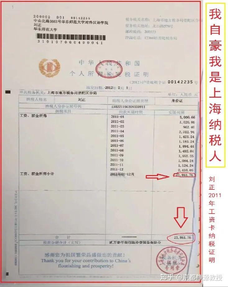 过去有一句话说得好,“穷文富武”——不仅仅是为了保护家中财产逼得富裕人家的公子不得不学习武术,还因为只有富裕人家的家庭才供养得起师傅。看看尤师伯在上海是怎么供养老先生的?真正的“吃喝嫖赌全报销”!再看看我每次去李见宇师傅家里学拳的基本开销:学费每次一个红包(多少自定,我基本是每次168元,图个吉利),打车去和平门烤鸭店往返40元,烤鸭半只加餐饮套餐每次大约280元(时价),李师傅再去洗澡(门票20元,“其他”则实费另计),没有“其他”实费另计的话,我就要花费508元;外加借款3-500元,总计就是808-1080元上下。加上“其他”实费另计总额绝对不少于1500元。那时,我在中国人民大学当教授的每月工资卡总收入大约是16000-18000元不等,几乎是我的当月工资卡收入的十分之一。我在上海华东师范大学当教授的时代,每月总收入分三部分:大学工资卡收入、大学现金收入、额外灰色收入(包括:外出讲课和撰写公司委托的研究报告、公司历史和老板传记等等,对方付税)。我这里只公布一张我保存至今的大学工资卡收入的上税记录,如下: