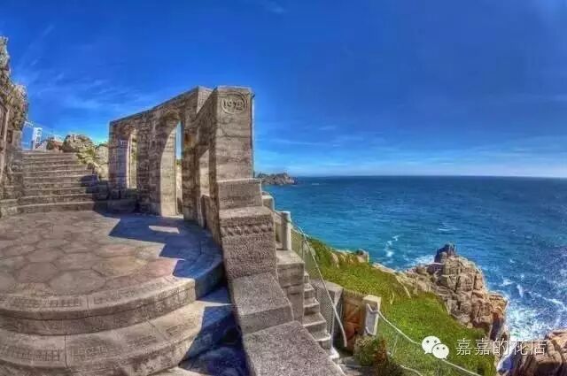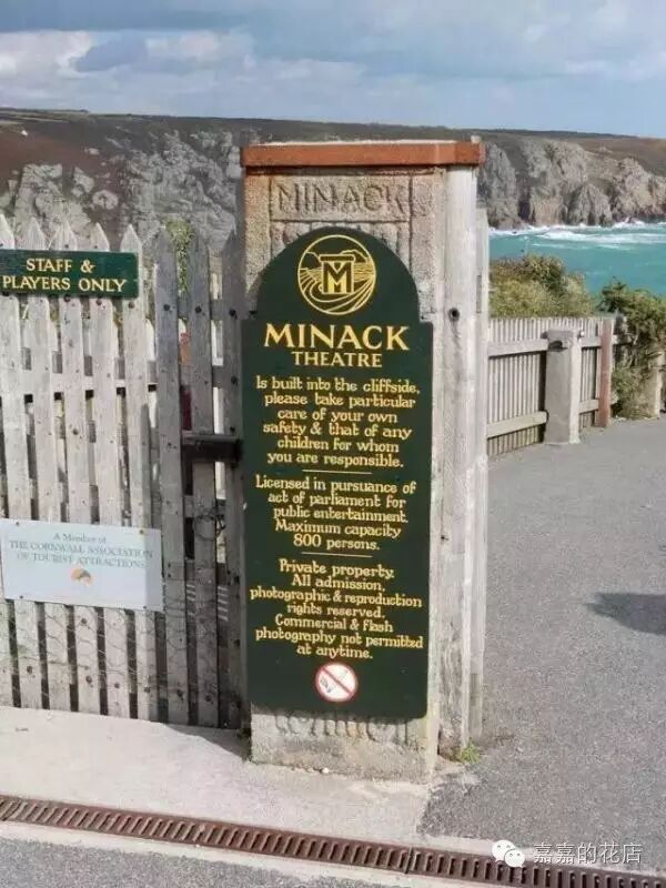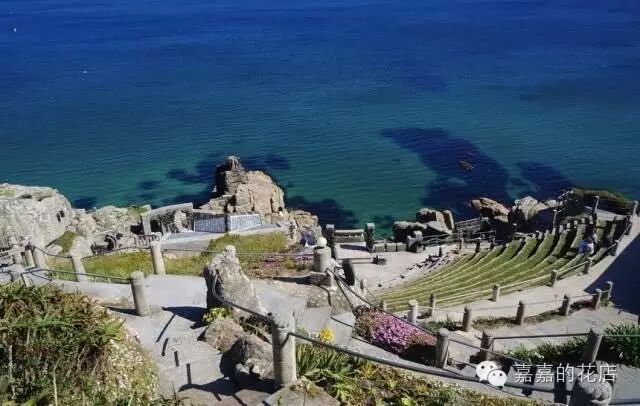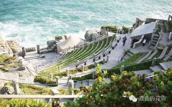 有没有人被这依山傍海的古罗马式舞台吸引?原来这样一个背朝大海的“天然”舞台并不是什么历史古迹,不过是出自一位莎士比亚戏剧迷,一个瘦弱的英国女子Rowena Cade用了50年时间,一点点堆磨出来的。这个小剧场名叫The Minack Theatre(米奈克剧场),Minack是本地Cornwall(英郡康沃尔语),意思是“岩石的、石头的”。剧场原是Rowena Cade家的后院临海峭壁,位于英国的最西南角,一个叫Porthcourno(波斯科诺)的渔村小镇。