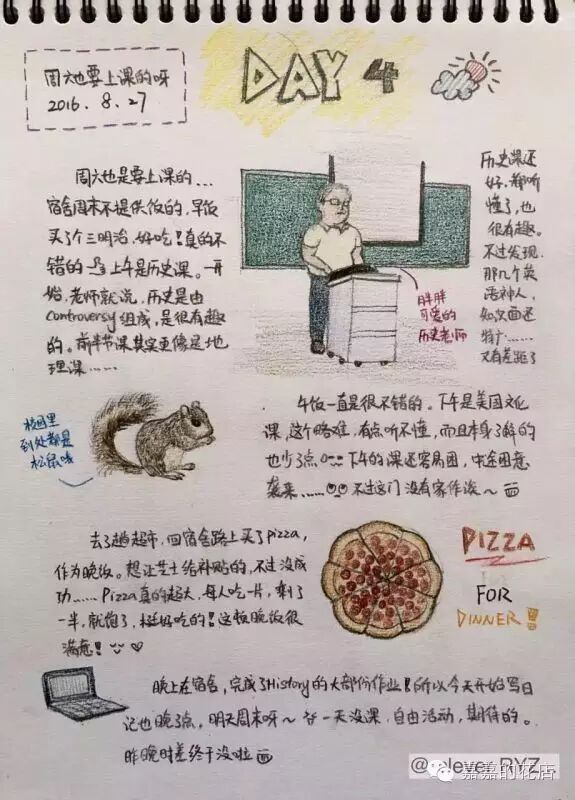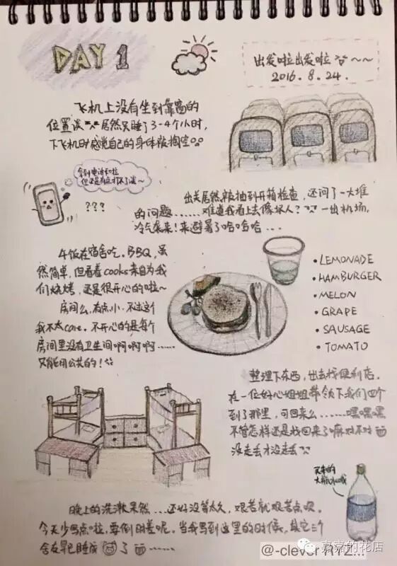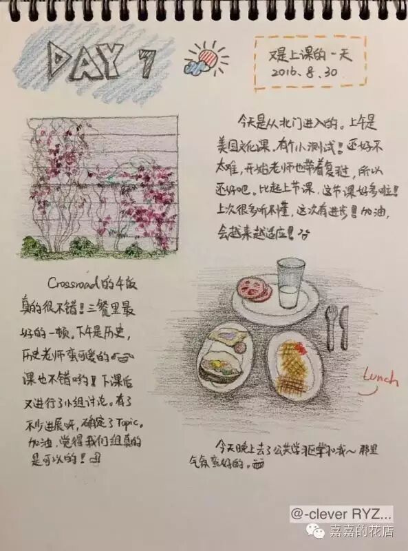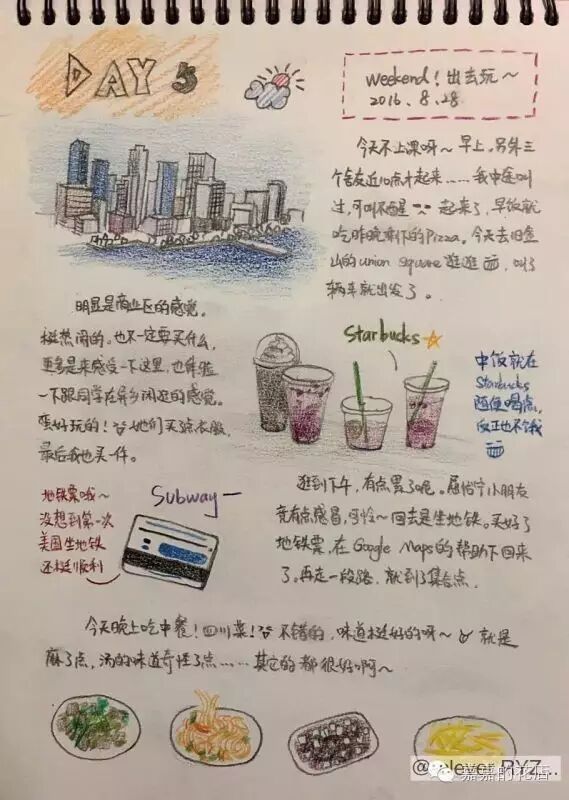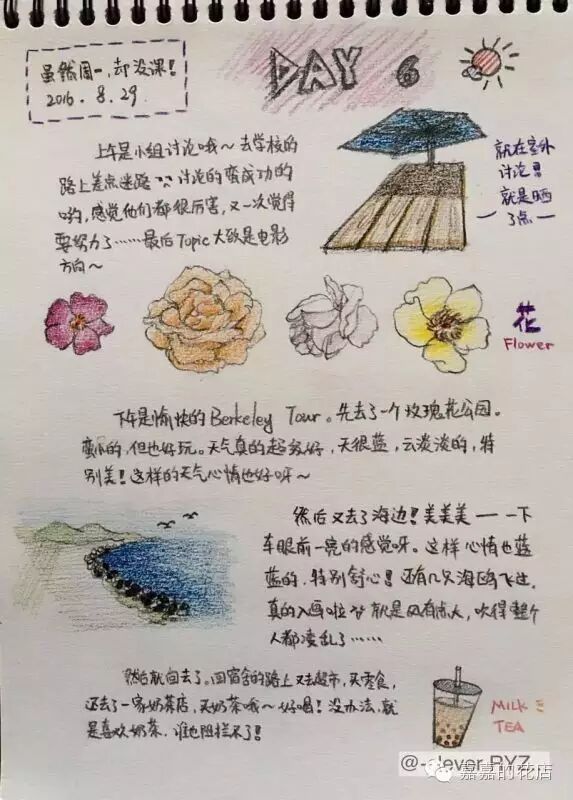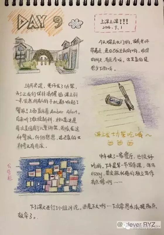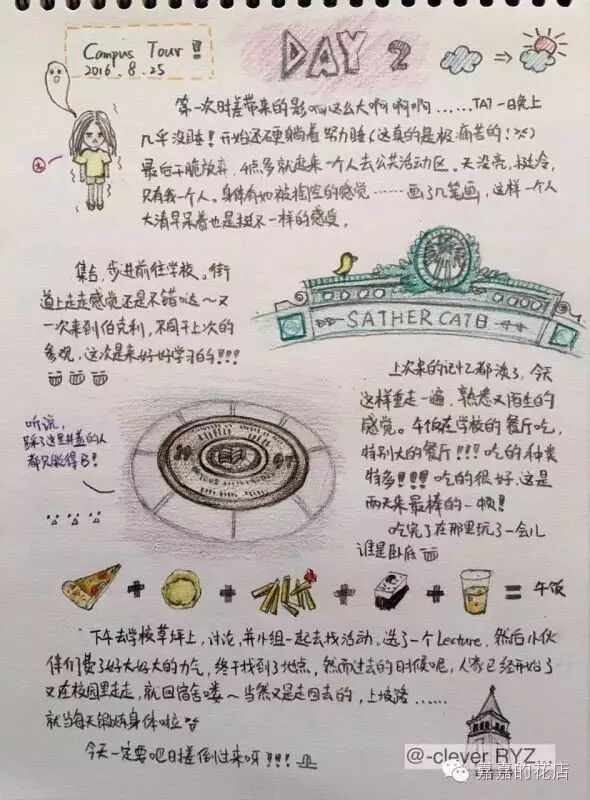 最近好朋友阿廖的儿子小C罗(嘉嘉的花店曾经登出一篇他写的文章《原来是这样》)考上了上海首屈一指的国际高中---平和双语学校,除了要求孩子们学习成绩优异,这是一所非常注重孩子综合素质教育的学校,我曾经看过一篇该校万玮校长的2015年新生致辞,用了整个篇幅就在讲如何做一个有修养且有情怀的合格人才。很为孩子能在这样的学校学习而高兴,最近他们正在美国伯克利进行为期四十天的学习生活, 分享一下这次项目B班的Lucy同学手绘日记。一个新高一学生用笔记录点滴,热爱生活细心观察,充满正能量的游学记忆 ,值得赞叹!