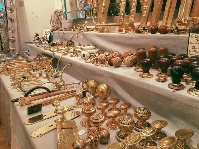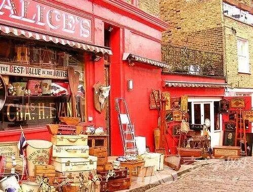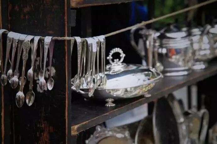 英国最有名的跳蚤市场要属诺丁山 ( Notting Hill ) 的波托贝洛市场(Portobello Road Market),这里因为游客颇多,所以会参杂很多旅游纪念品,能否淘到真正有历史的好物件就要靠你的眼力啦。光是一个抽屉或门的把手,就可以自成一个店面,铺天盖地,各种材质各种款式够你花眼的。好几个售卖银器的小推车前总是挤满了人,纯银的、镀银的,纯银镀金的,那些曾经只在电影里看到的优雅下午茶茶具:茶壶,奶杯、糖托、托盘,勺子、叉子,一一呈现在眼前,每一个器物上都有小小的钢戳,代表着不同时代的印记,说明了产地、制造的工厂、材质。也有各种年代的手袋、鞋子、帽子、首饰......古董缝纫机、照相机、手表应有尽有......