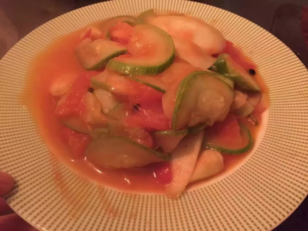 西红柿+西葫芦+茭白,这个不用说吧,几样切片,入锅翻炒