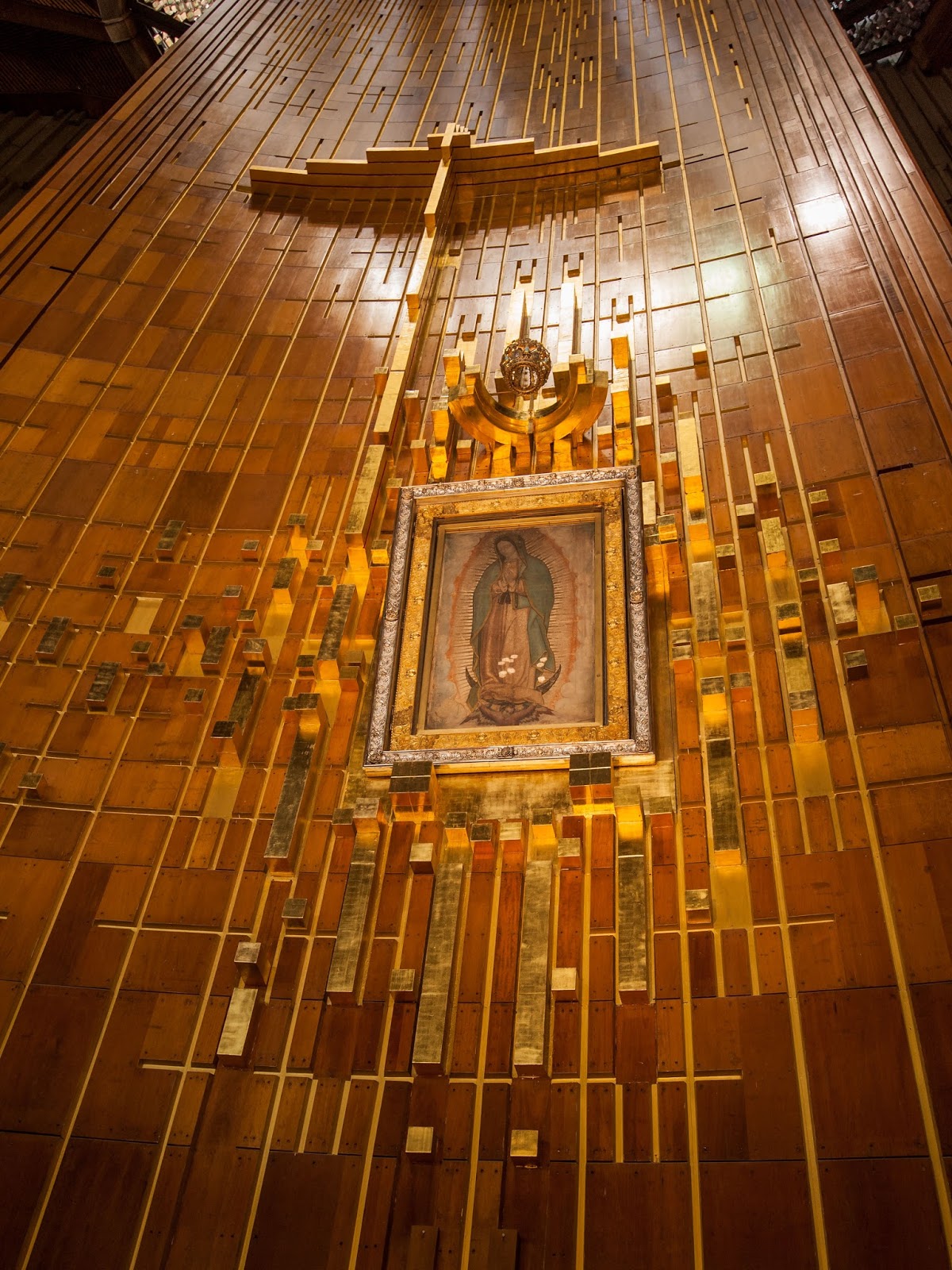 Image of Our Lady of Guadalupe in the New Basilica,因为瞻仰的人众多,特意在地下安装了一个移动电梯,以防止拥堵。