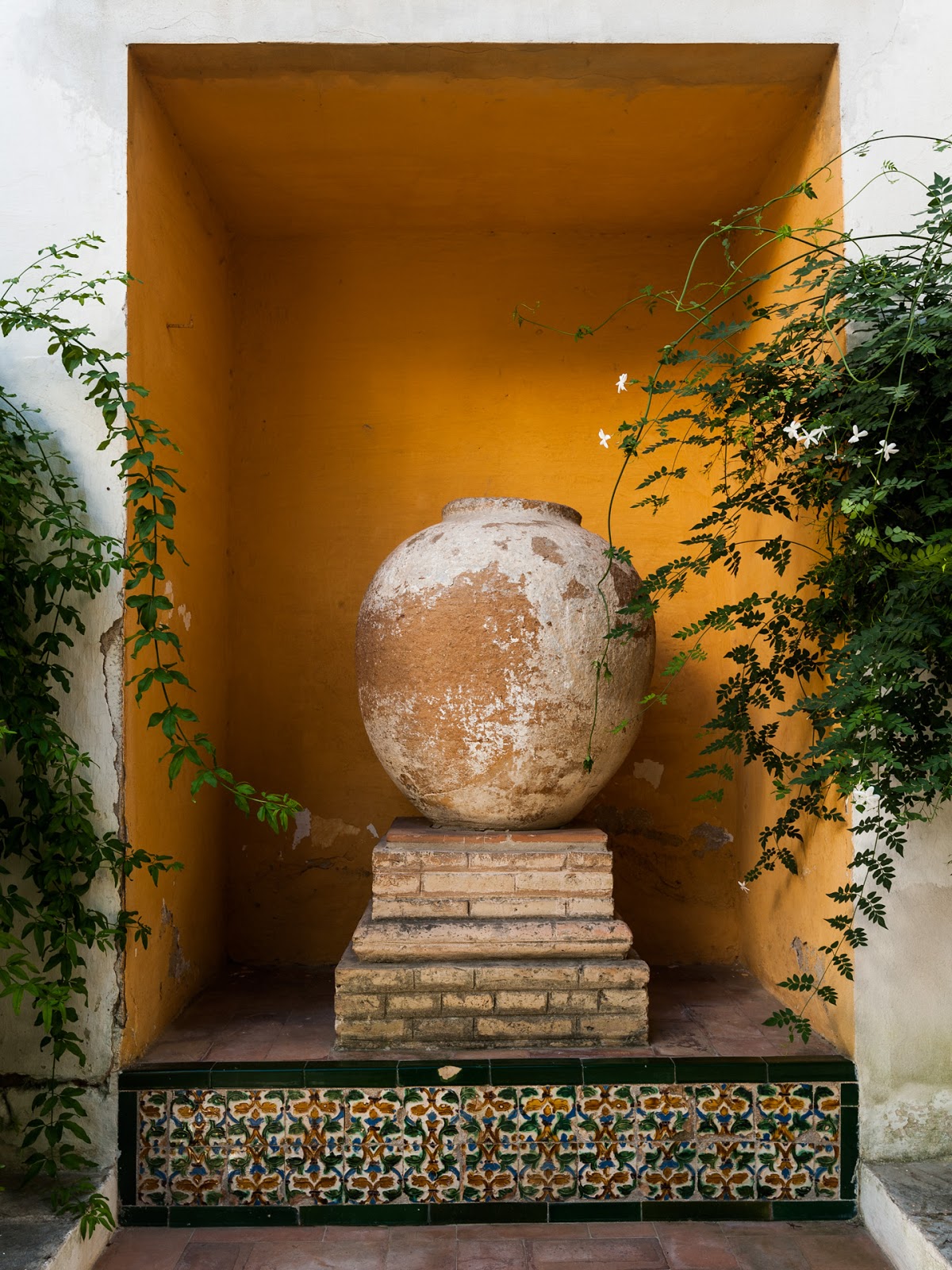 Decorative wooden door and tiled walls inside the Patio de las Munecas