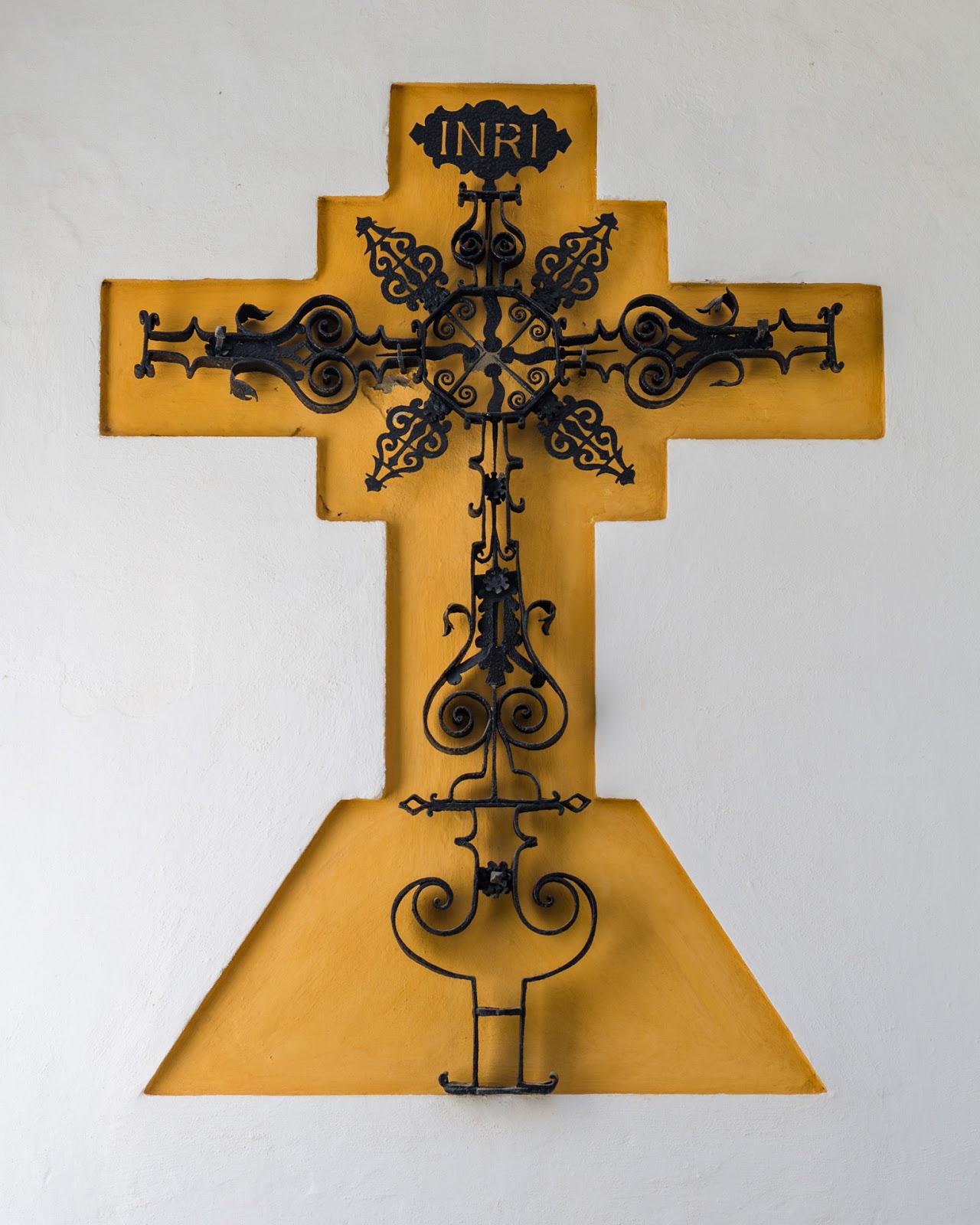 Antique Spanish cast iron cross on display on a wall