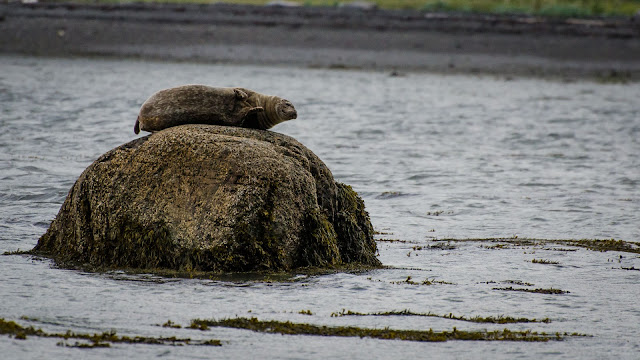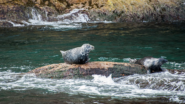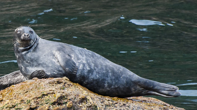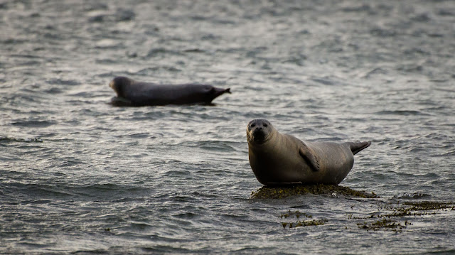 游船接近鸟岛时看到很多海豹在水中石上游弋歇息