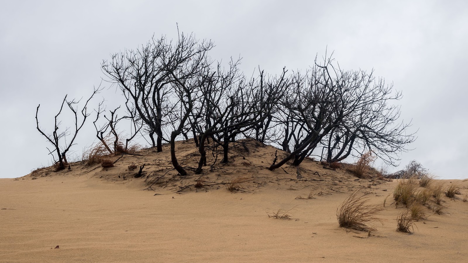 没走多远一大片沙丘就呈现在眼前。蒙蒙的细雨给沙丘涂上了一抹姜黄,远处有两个人在沙丘中行走,一会儿也不见了踪影,整个沙丘似乎暂时被我们拥有。