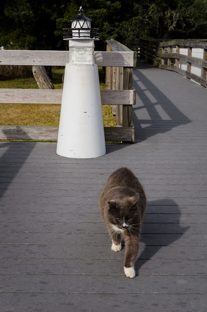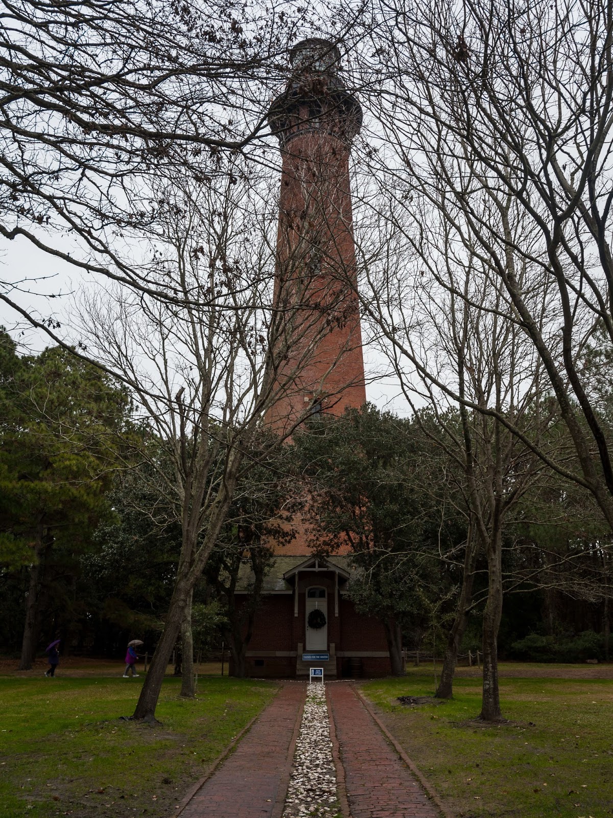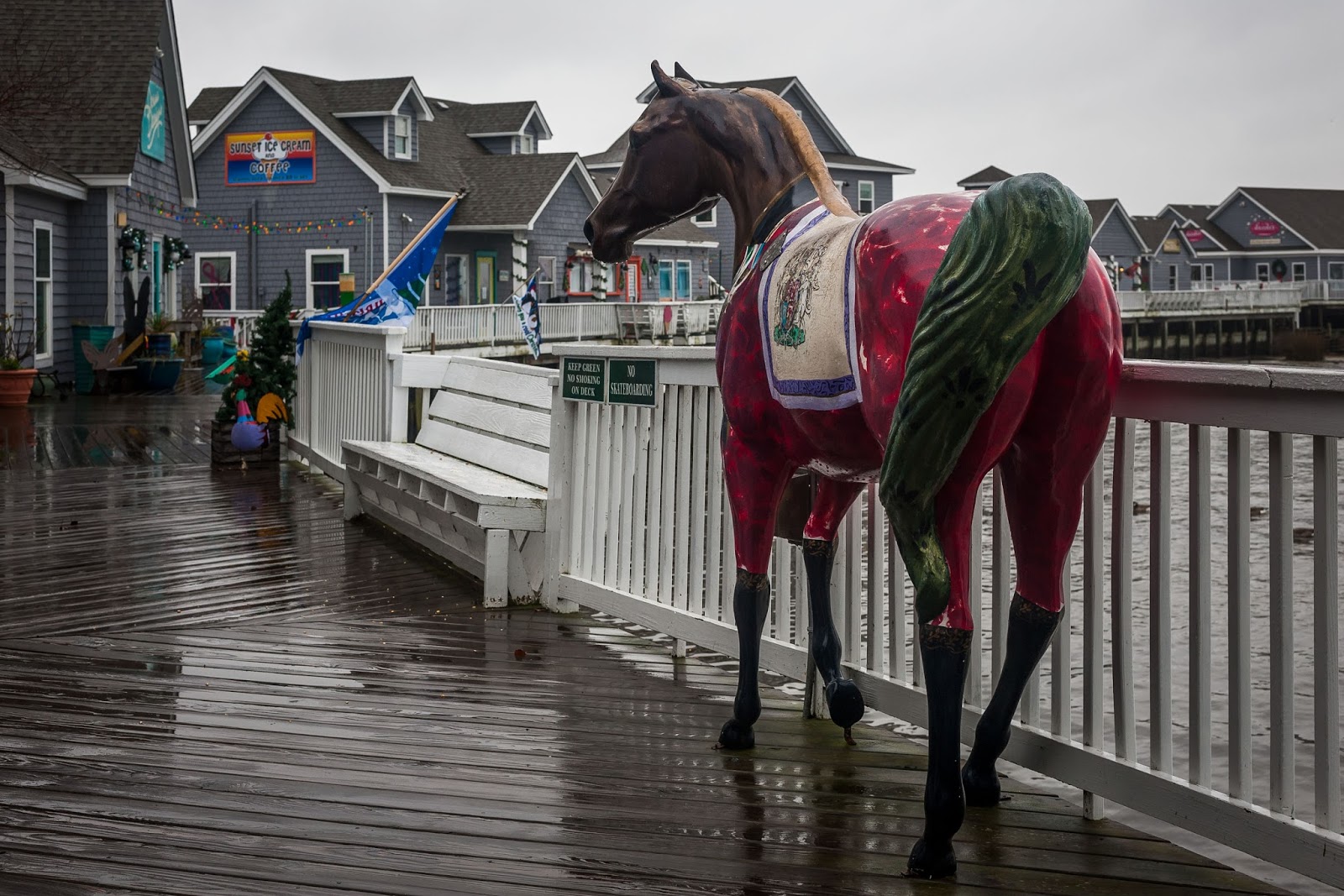 The little town of Duck, 有一条长长的沿水而建的木制步道,旁边有很多装饰赏心悦目的礼品店,正值圣诞前夜,基本都不开门。除了几个遛狗的本地居民,好像只有我们独享这风声雨声,和这份湿润的惬意。水中不远处有一只嘴里叼着鱼大蓝鹭,看到我们仍很淡定,不慌不忙地把鱼吞入囊中。