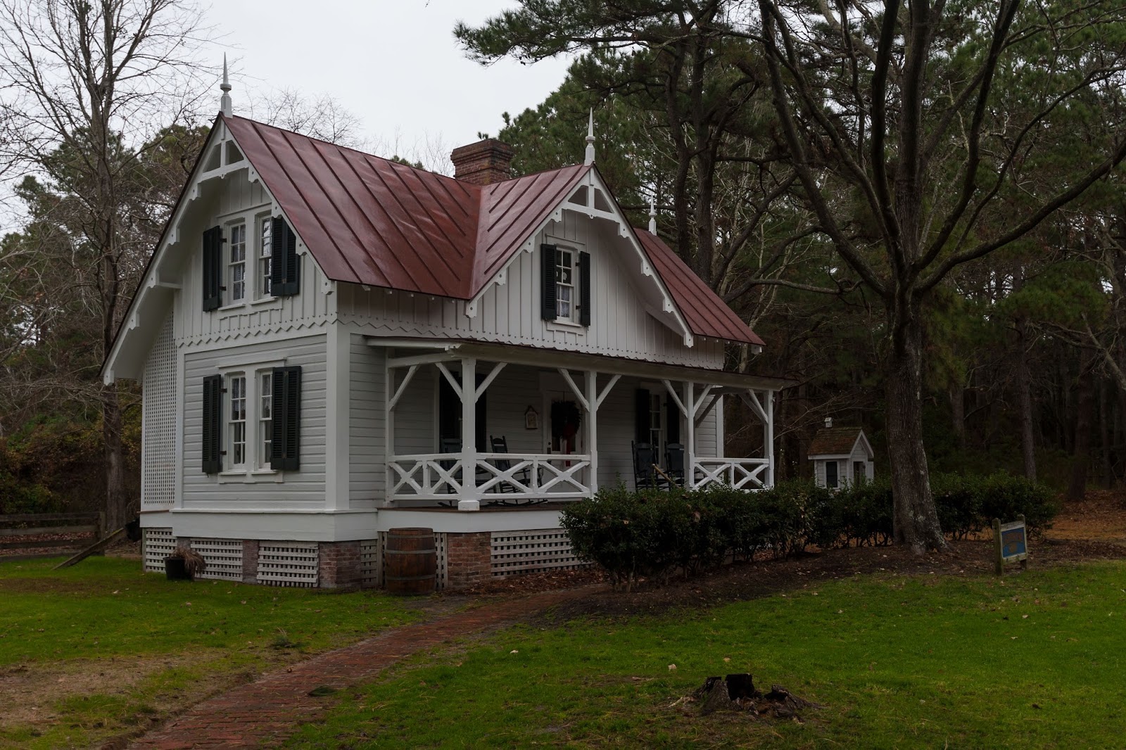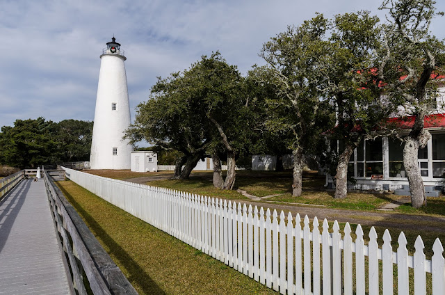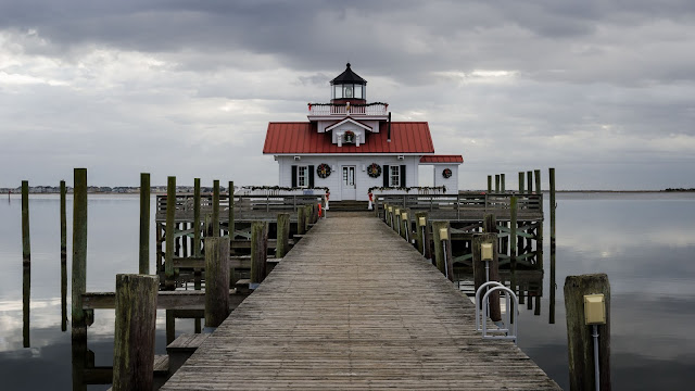 Roanoke Marshes Lighthouse, 白房红顶,在圣诞花环的装点下非常养眼