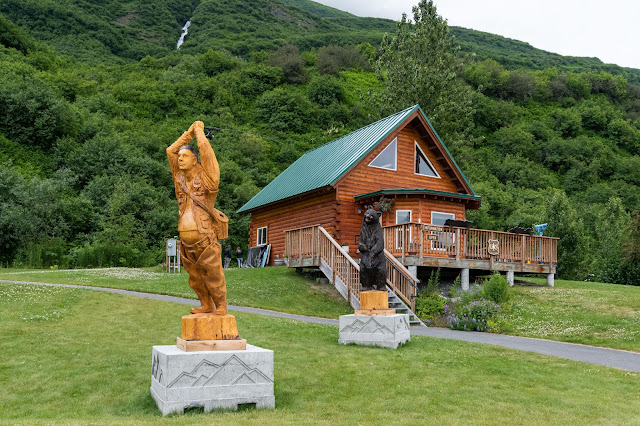 游客中心就坐落在这个背枕青山的小木屋里,前面有个"人钓熊"的木雕很有趣。