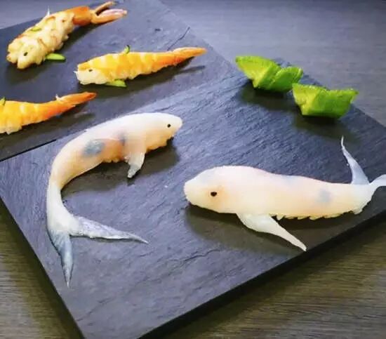 日本小哥Jun发明出来的鲤鱼寿司,是货真价实的寿司哦。外面是晶莹剔透的鱿鱼皮包裹着米饭,看起来很十分的精致。