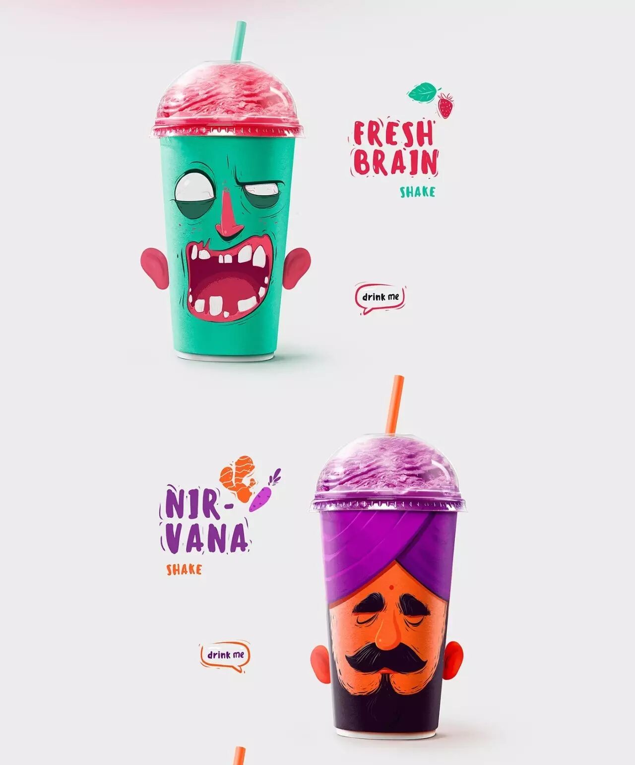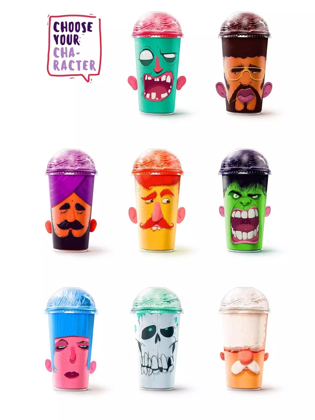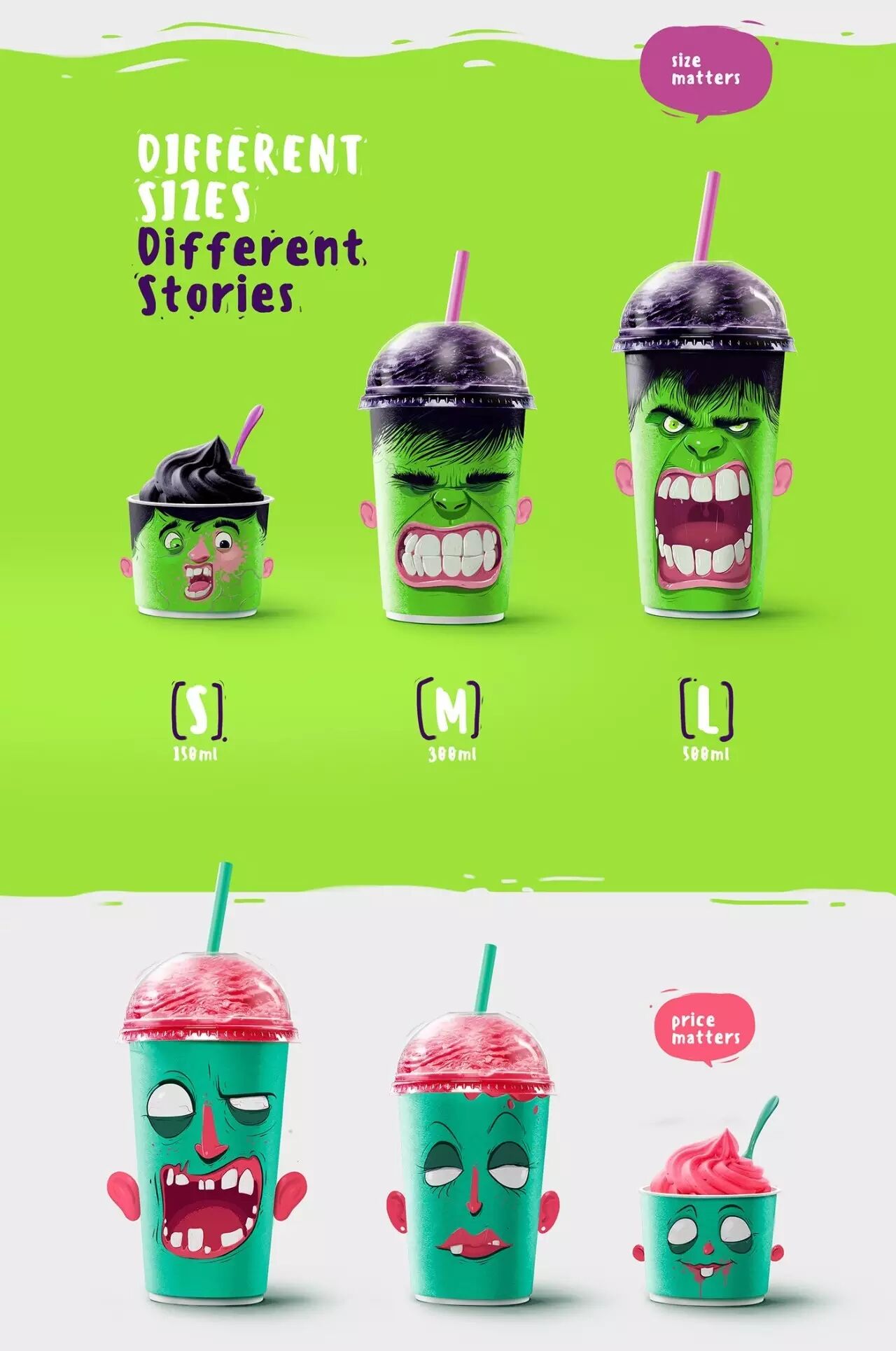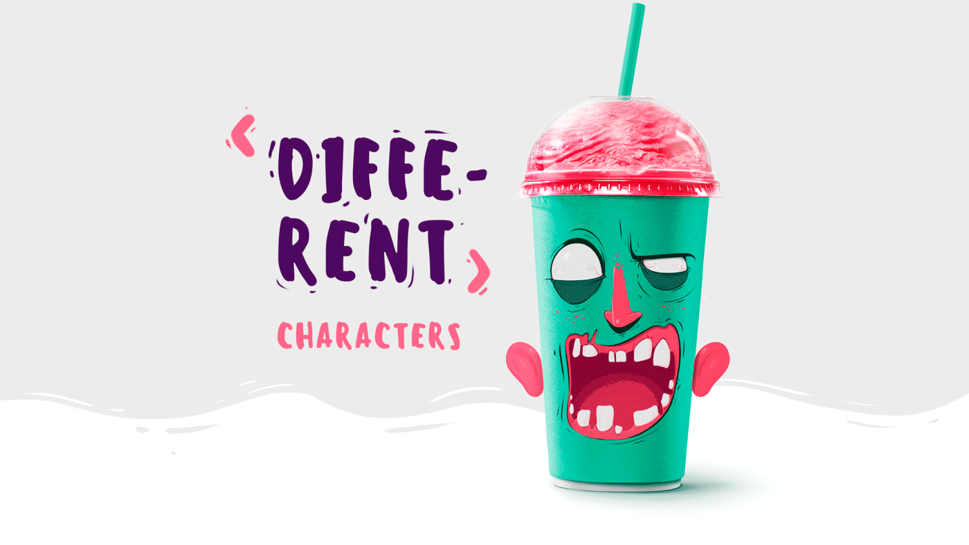 对应不同的口味,包装杯上印有不同的角色,恶搞的表情仿佛是在吸他们的大脑。在杯子的两侧还有翻开的耳朵,除了骷髅以外。不同的容量还有不同的表情,巧妙的配色,搭配恰当的角色味道,肯定让人印象深刻。