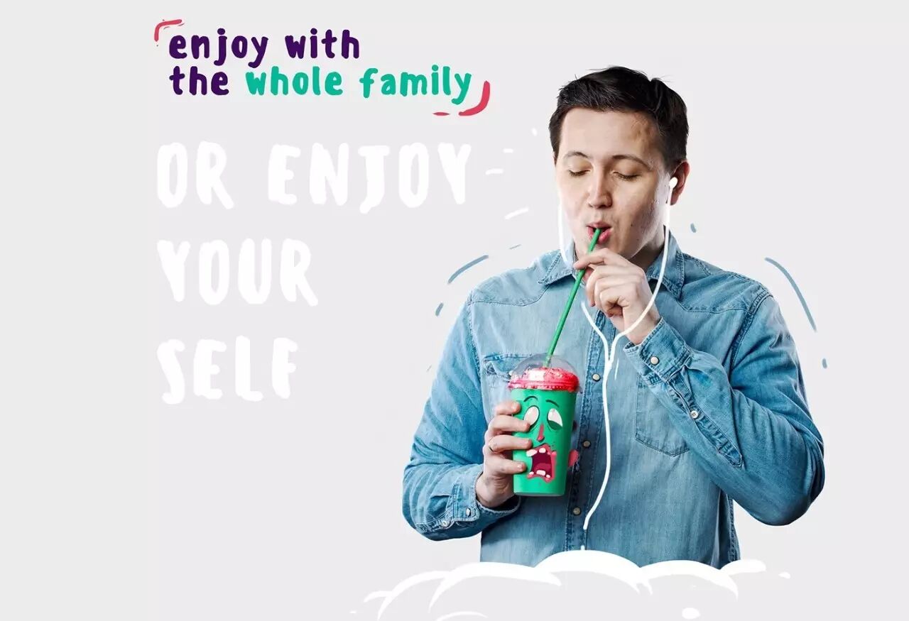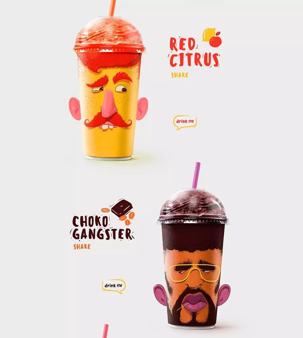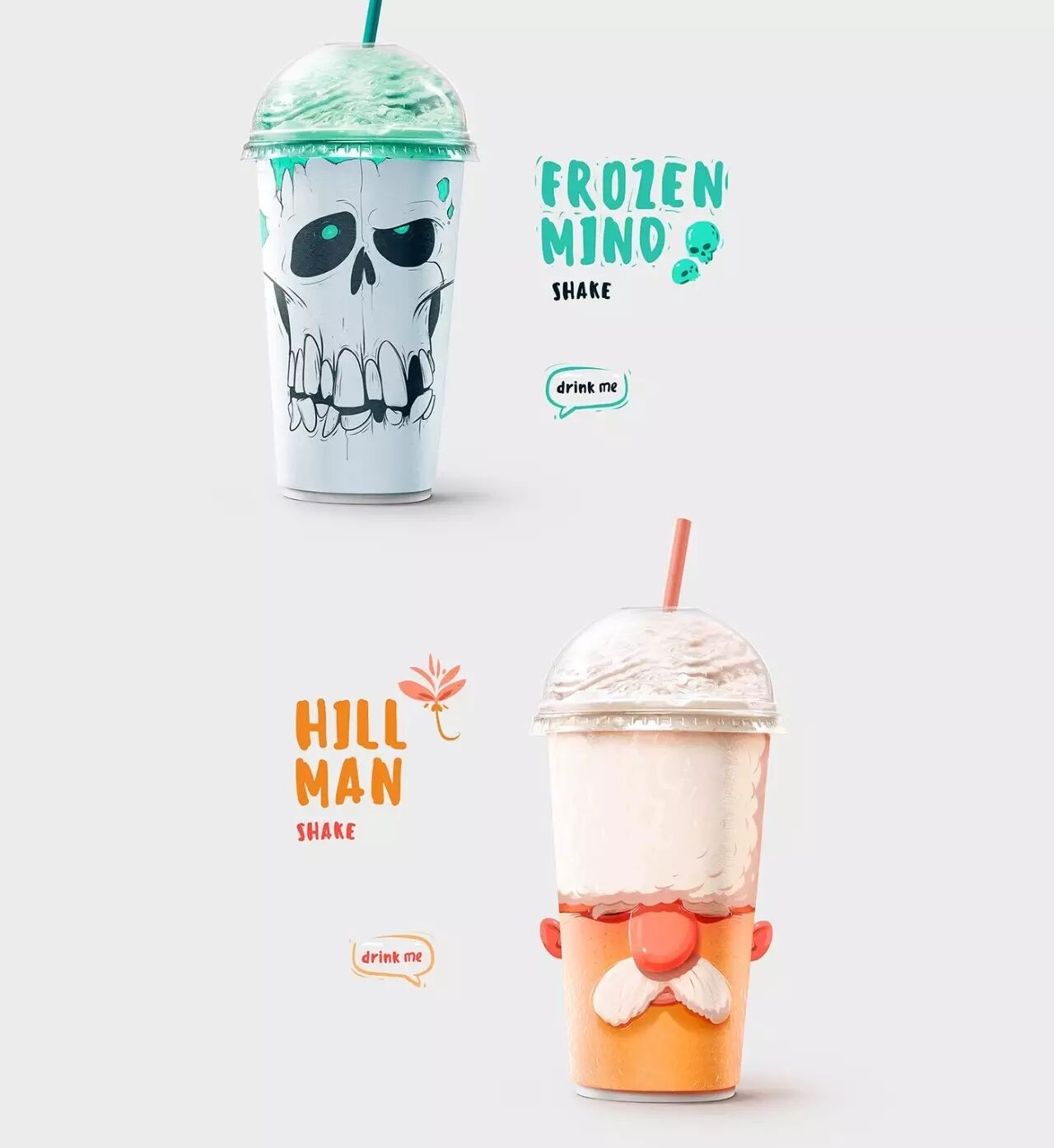 对应不同的口味,包装杯上印有不同的角色,恶搞的表情仿佛是在吸他们的大脑。在杯子的两侧还有翻开的耳朵,除了骷髅以外。不同的容量还有不同的表情,巧妙的配色,搭配恰当的角色味道,肯定让人印象深刻。