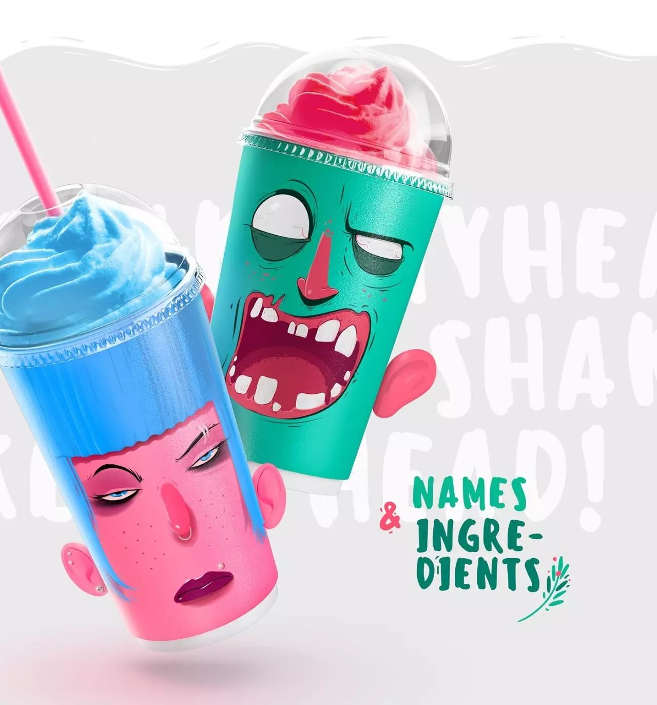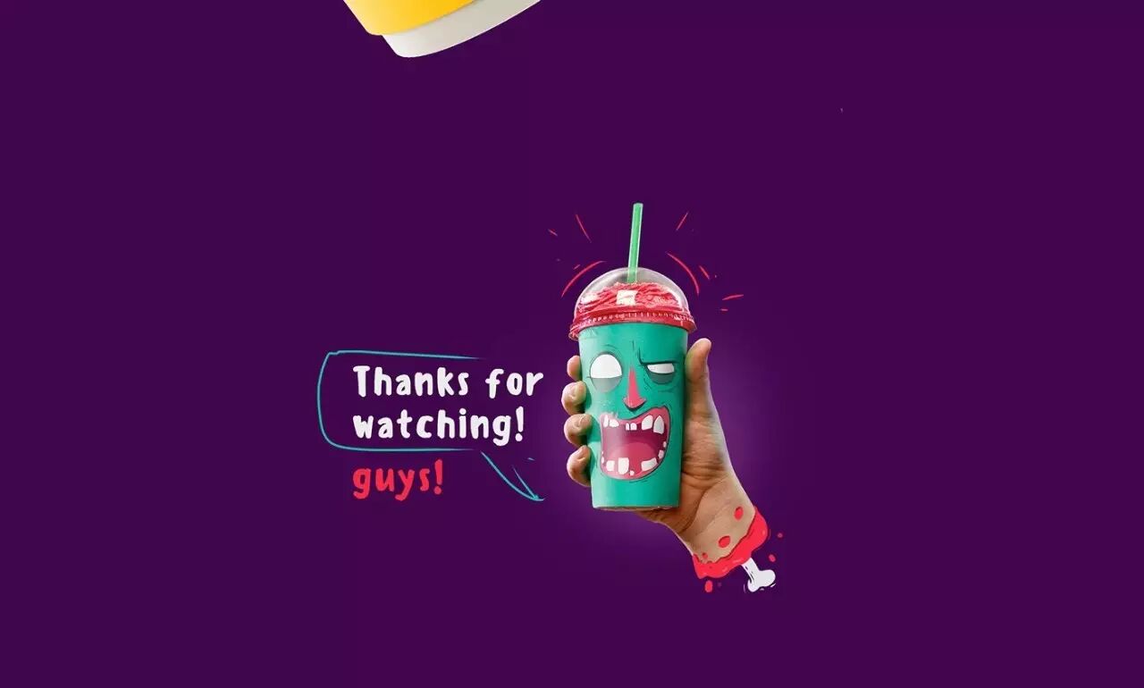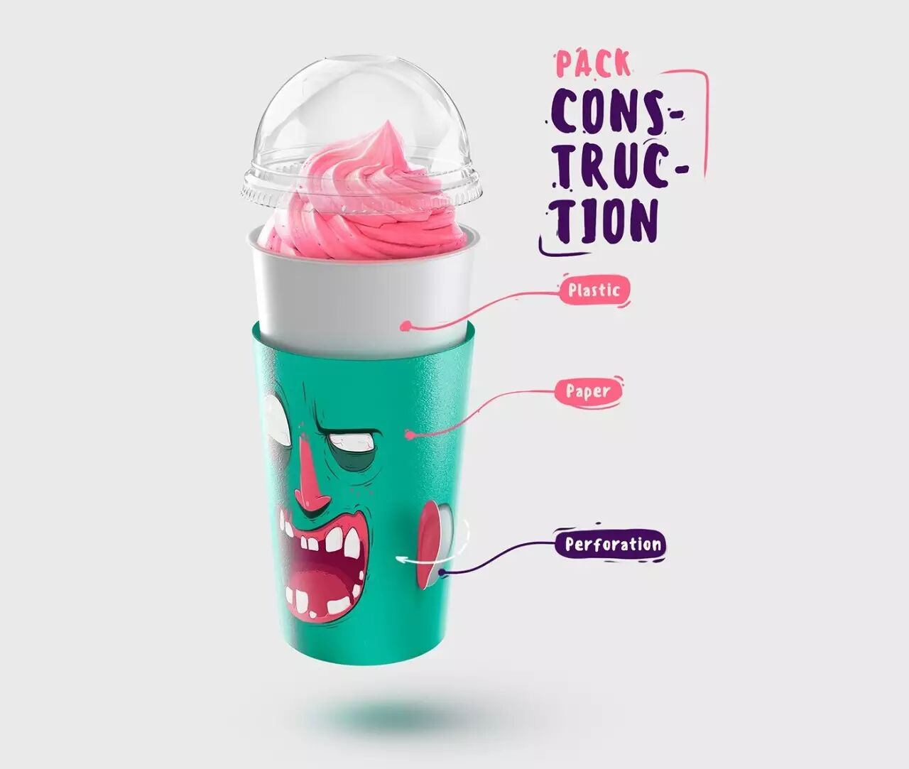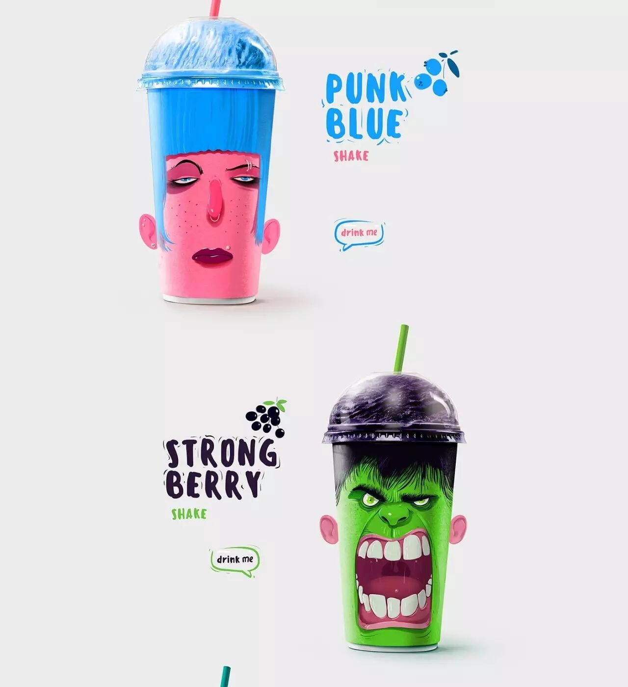 对应不同的口味,包装杯上印有不同的角色,恶搞的表情仿佛是在吸他们的大脑。在杯子的两侧还有翻开的耳朵,除了骷髅以外。不同的容量还有不同的表情,巧妙的配色,搭配恰当的角色味道,肯定让人印象深刻。