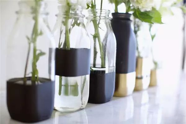 一些酒瓶、玻璃瓶是最常见也是最能呈现植物美感的器皿,所以家里用过的这些瓶子一定要记得收好,淘洗干净后,自己可以用一些类似喷漆、胶带、麻绳等细小装饰物,就能轻松完成一个独一无二的花瓶。