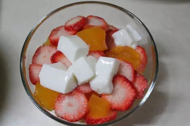 用料:橙汁100克、草莓6颗、吉利丁3.5克
