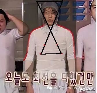 最后,野兽君还发现,如果以刘在石的两点做为三角形两底角点,两腰经过李准基的两点直至交叉并继续延伸,以两人头顶水平线做倒三角形的底边,结果可以看到,两个对角三角形是一样的,并且两人的头部都在倒三角形中。