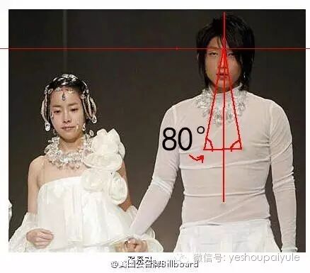 野兽君挑选了一组有参考价值的模特来做对比,发现其他模特的乳距三角形底角都在75度左右