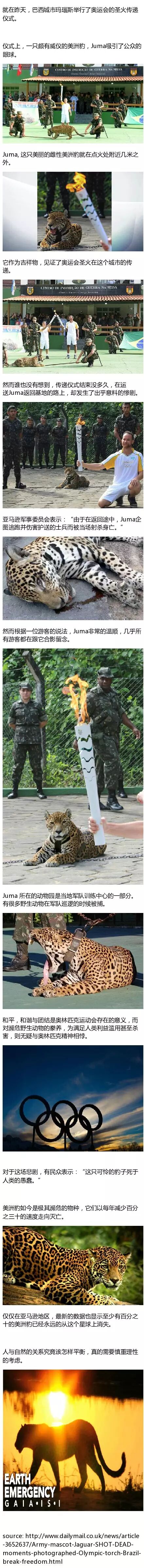 「20」一只野生美洲豹被当作“吉祥物”,在见证了奥运会圣火在巴西城市玛瑙斯的传递后,因所谓“安全考量”而被射杀身亡。