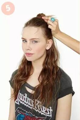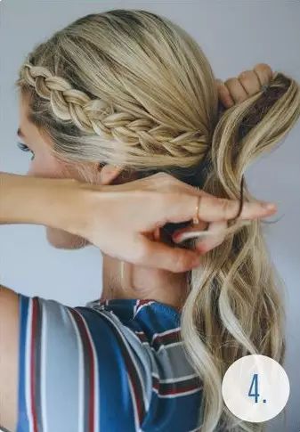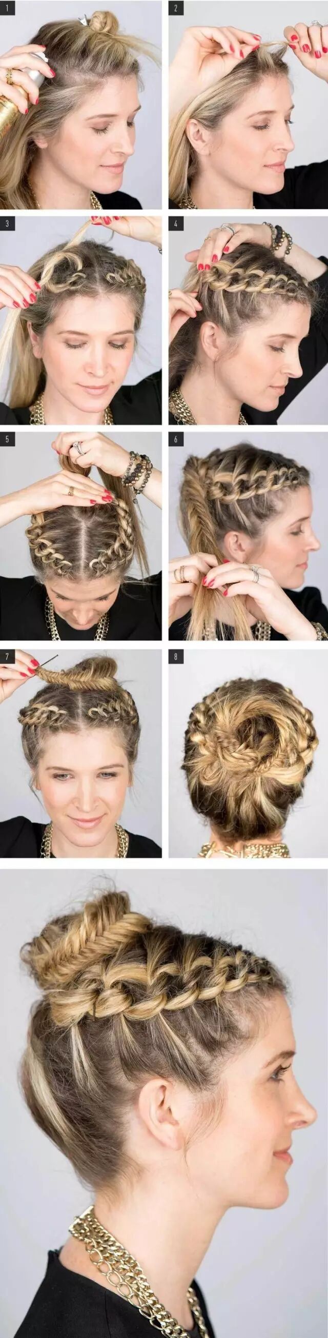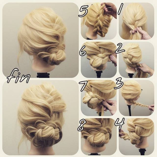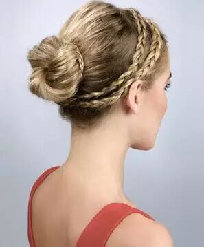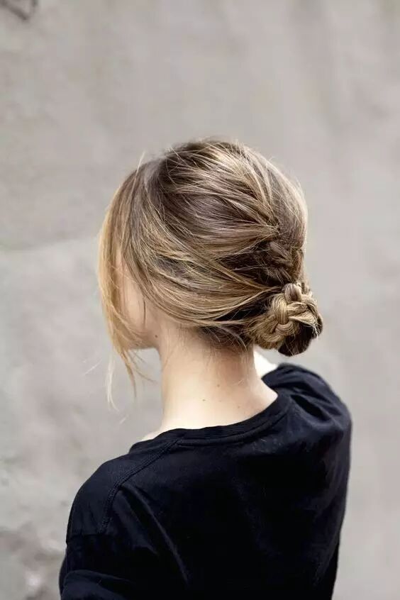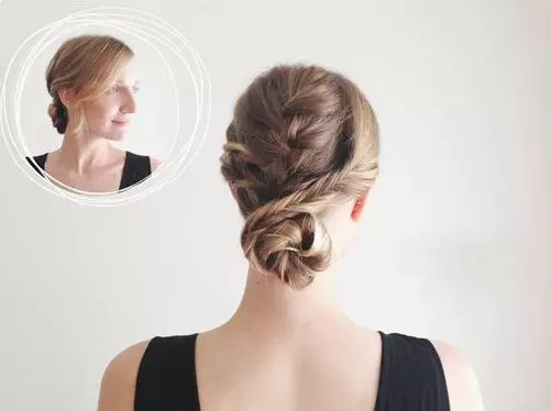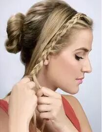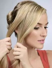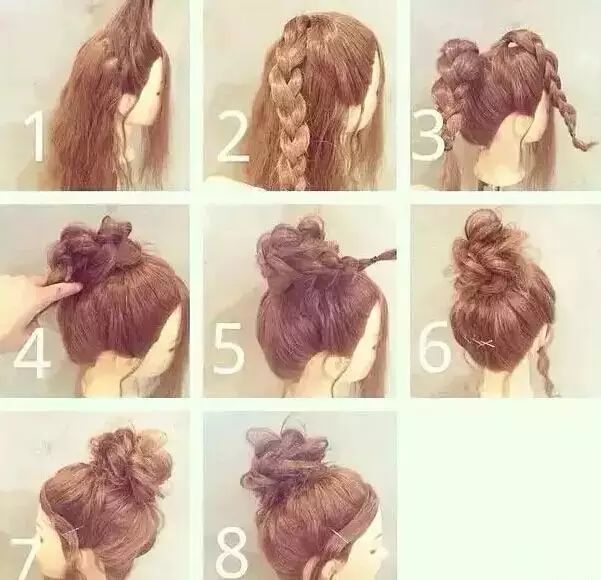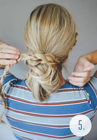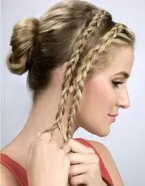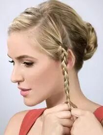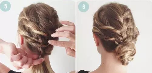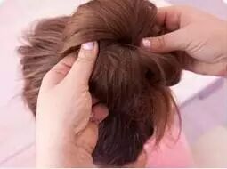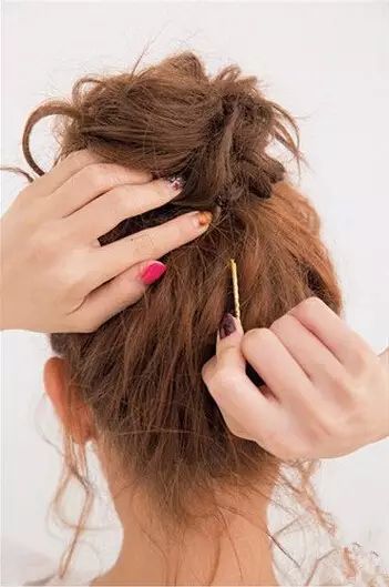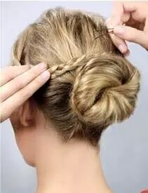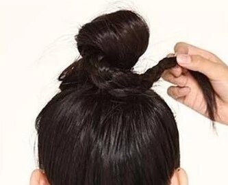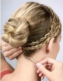 Step 5:撇开稍粗的发辫,其余头发挽成一个发髻,然后用发辫缠绕发髻并用发卡固定。舒适又美丽。扎法四