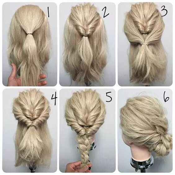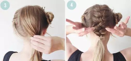 Step 5:放下左边的头发,把头发分成上下两份。把这两份头发在分成两份后各自拧转后插入法式辫中,发尾也和中间的头发绑成一个马尾。Step 6:将马尾盘成一个丸子头。