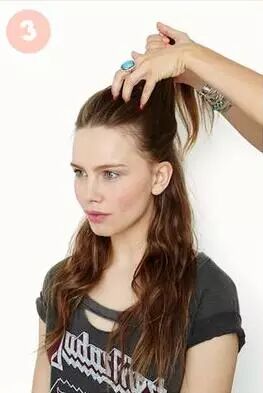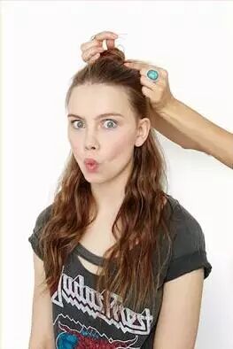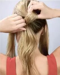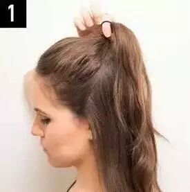 STEP1:将头发扎一个高高的马尾。如何扎马尾才能更加自然呢,秘诀有两个。第一,在扎发前用梳子将头发倒梳打毛。第二,用手指梳理头发而不是用梳子。