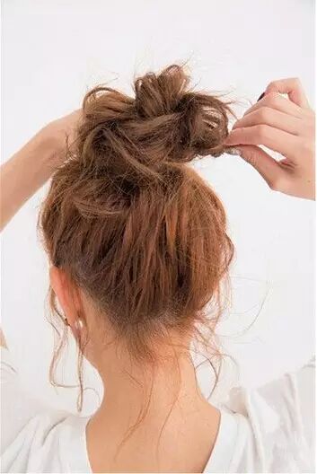 STEP9:用一根皮筋将丸子头固定,然后调整发髻的形状。
