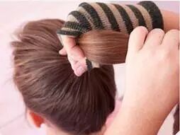 STEP4:一只手固定袜子,一只手将马尾从袜子中掏出。