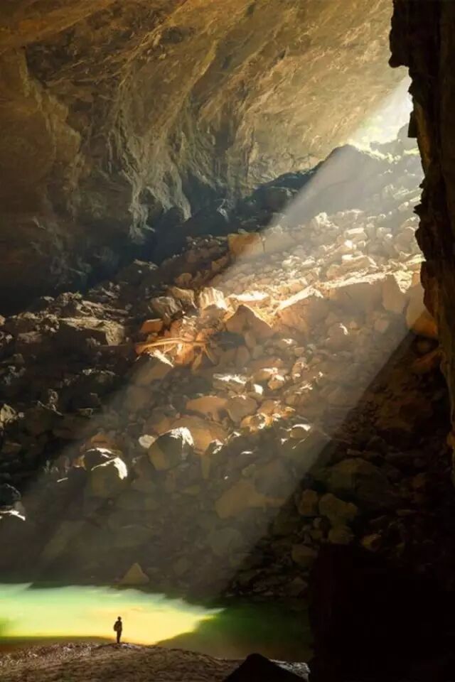 3.Hang En Cave, Vietnam。越南韩英洞,是越南饶同河穿越的一个洞穴,旱季,饶同河会萎缩成一系列小水塘,洪水季节,河水水位几乎可上涨91米,离著名的韩松洞仅有数公里。韩英洞中部的通行高度不断萎缩,经过洪水的无数次冲刷,洞顶已被打磨成扇贝形,一排排带凹槽的石灰岩犹如一个石化的瀑布,在绿色藻类的装饰下显得生机勃勃。