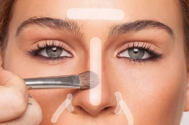 还要在鼻梁、T区和下巴几个地方打上高光。如果有需要,鼻翼两侧的缝隙、法令纹处也可以打上高光。▼