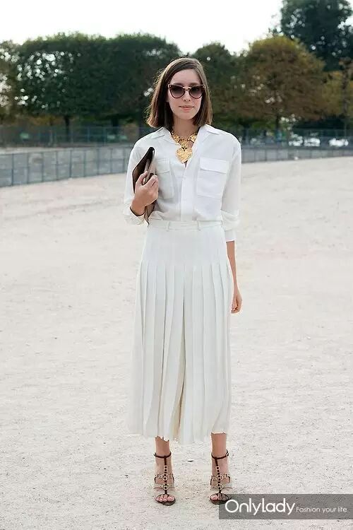 白衬衫+百褶裙+米色皮革高跟凉鞋+棕色皮革手拿包。金灿灿的oversize项链打破沉闷。