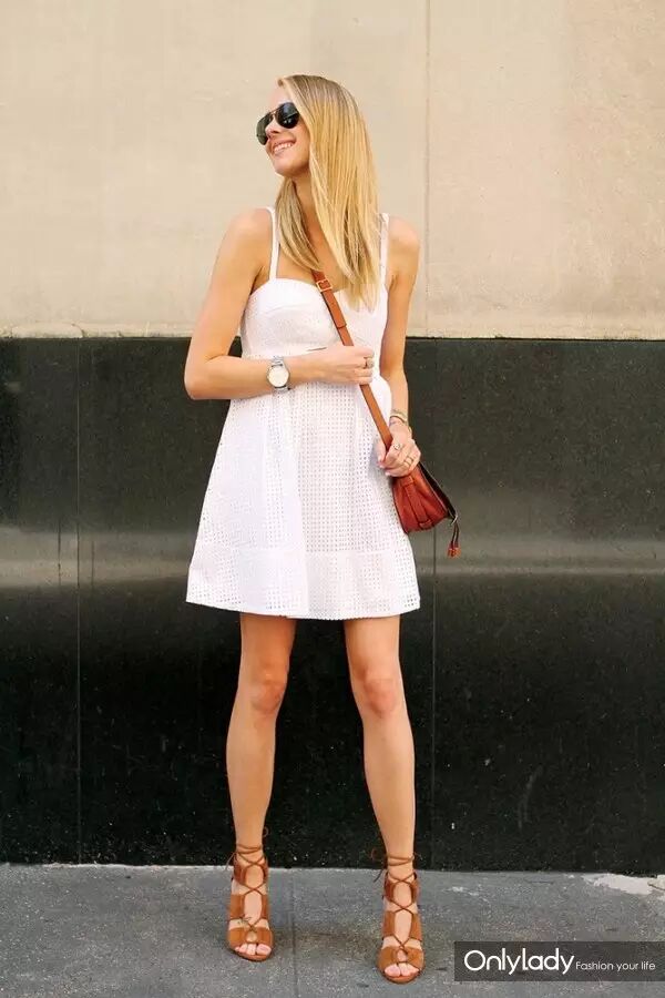 白色镂空吊带裙+棕色绑带高跟鞋+棕色马鞍包+银色精钢表,随性利索的打扮。