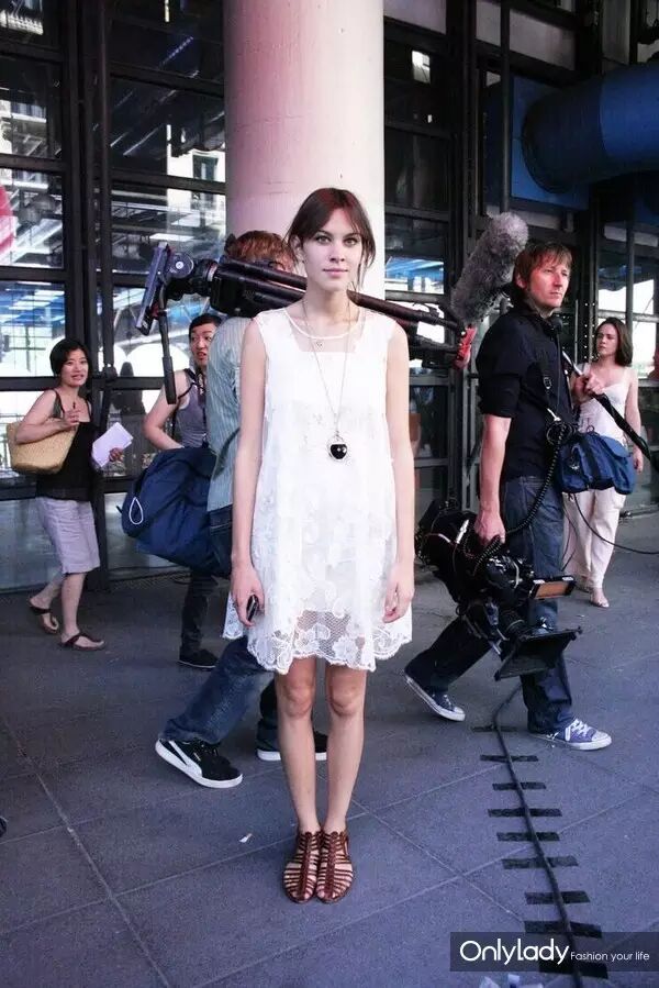 Alexa Chung白色连衣裙+棕色皮凉鞋+长项链。清纯之中又有一丝小性感。