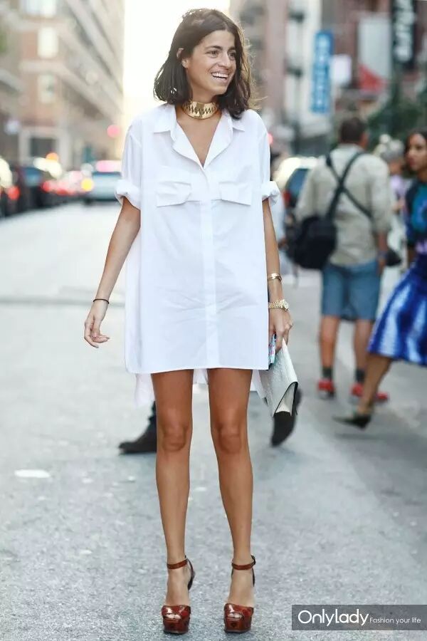 莉安德拉·梅丁(Leandra Medine)前短后长的衬衫裙+粗跟凉鞋,挽起袖子,搭配夸张的金色项圈+手镯+手表,从视觉上打造帅气的街头风格。