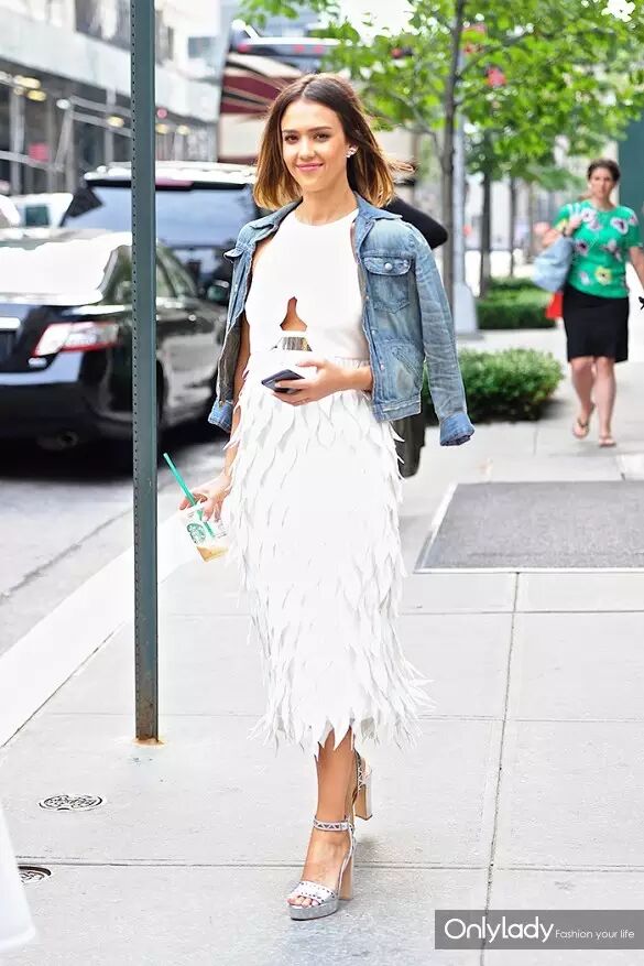 Jessica Alba(杰西卡-阿尔芭)白色连衣裙外搭一件牛仔外套清新自然;羽毛装饰随步伐摇曳生姿,腰间的镂空设计心机秀性感。闪闪的耳饰简单时髦,也为她这一身look增添一丝女人味。