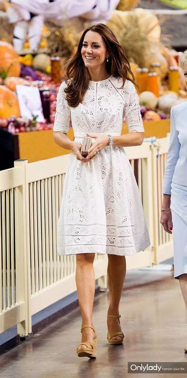 凯特王妃出访时的镂空小白裙+精钢腕表优雅端庄,落落大方。