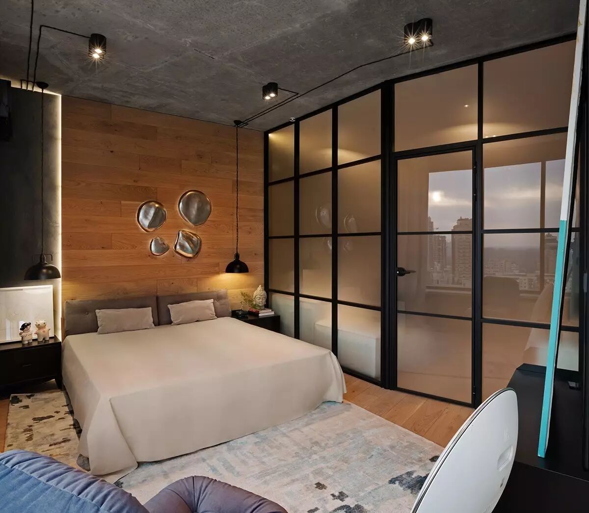 除了客厅和卧室之间的玻璃墙,主要的空间都是半开放的。金属和水泥带来强烈的工业风格,统一的木地板也让整体更便于打理。沙发和床选用淡色系的柔软材质,就像强硬的硬汉有一个温柔的心。