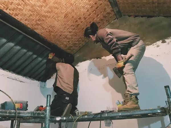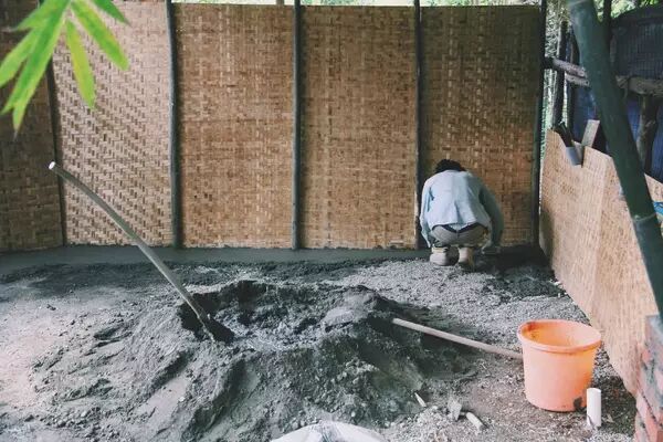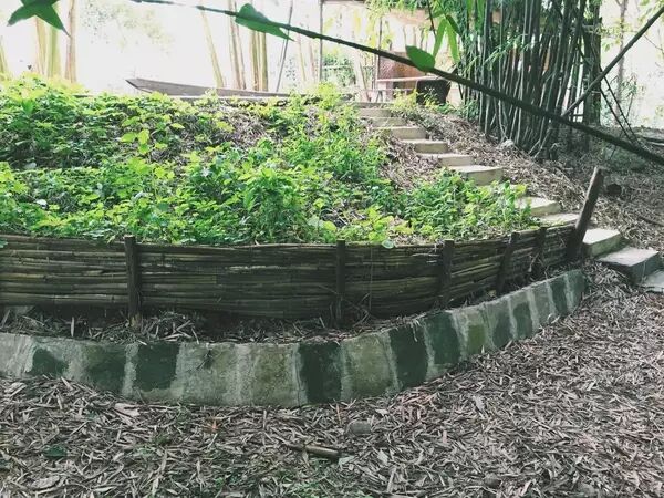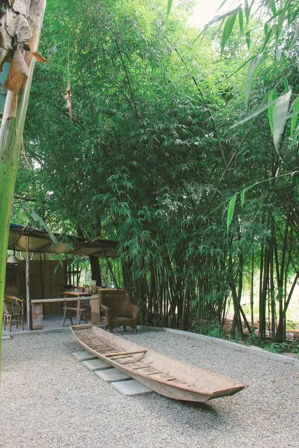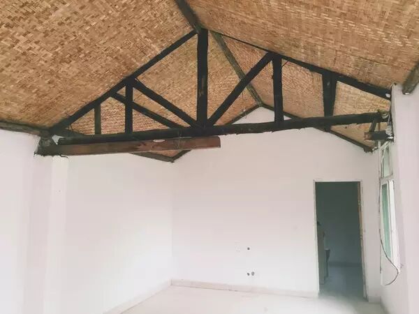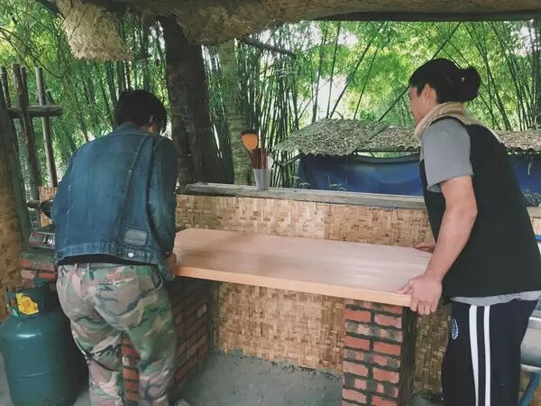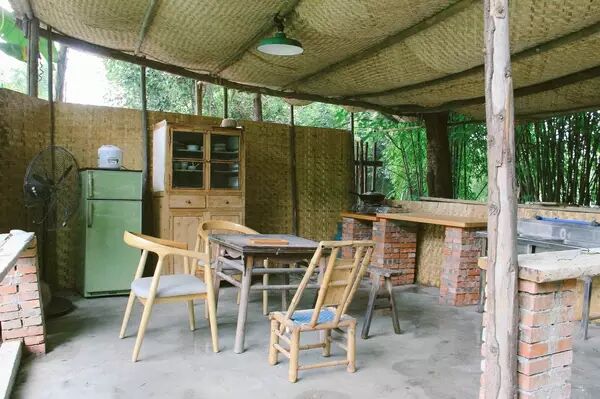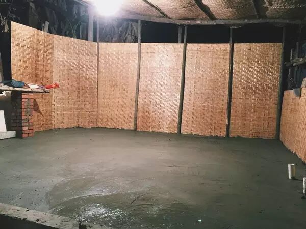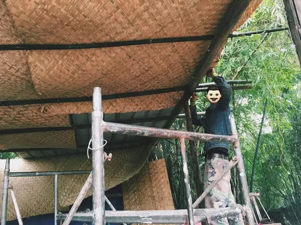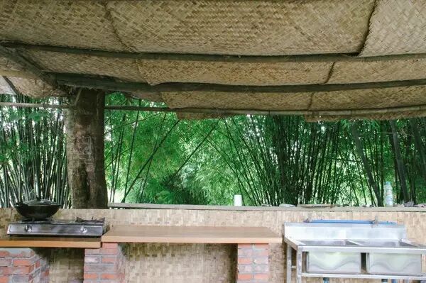 用竹席装饰棚顶;竹节板用来做成半开放式的围墙;铺好水泥地;