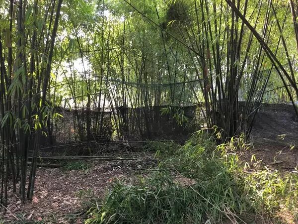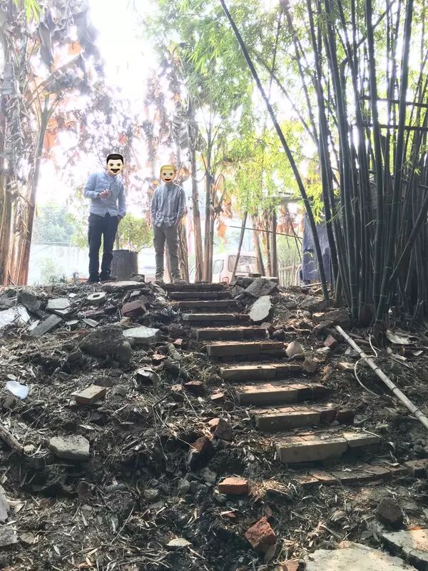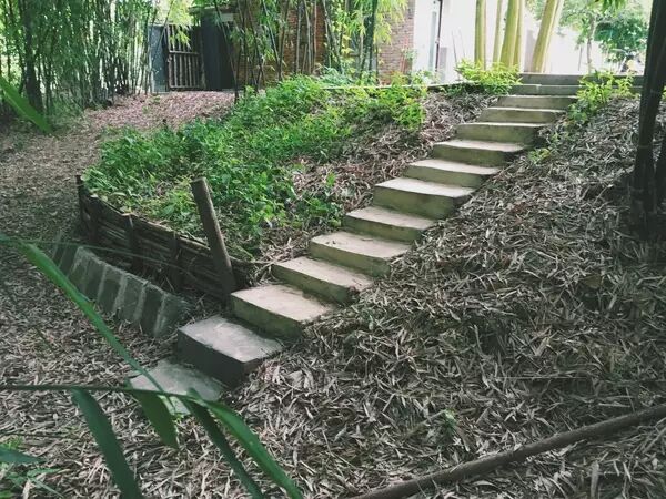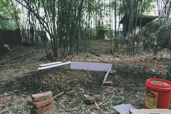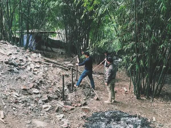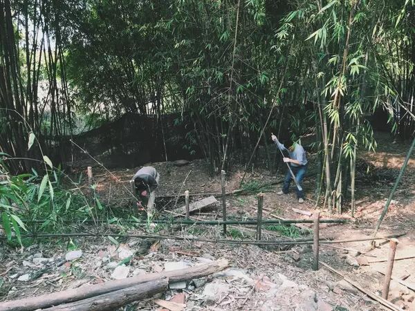 这就是原本围城鸡圈的竹林。整理不规整的斜坡,古大叔支招,打上木桩,就地取材,用竹竿和旧的石板做个围挡;