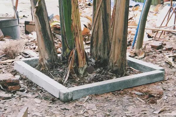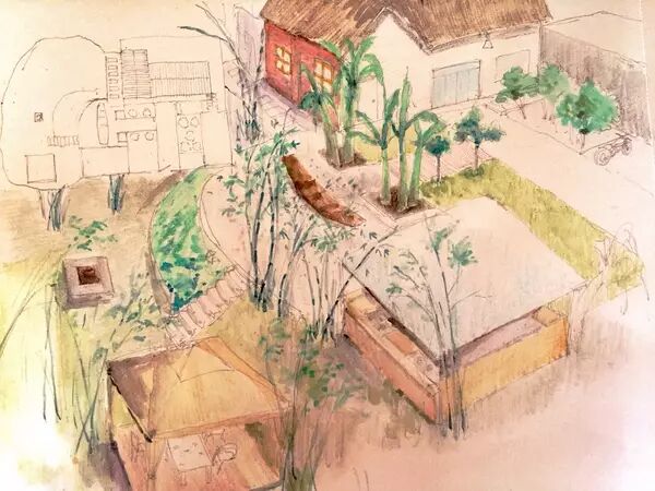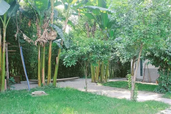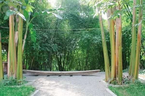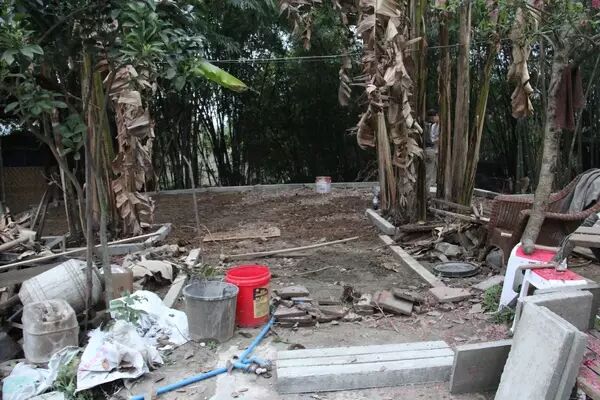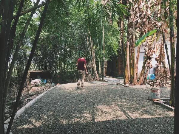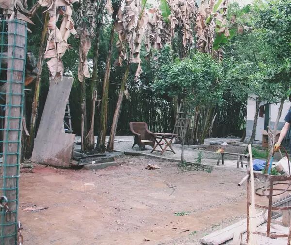 清除杂草,揭掉铺满院子的假草皮,移走影响格局的树;找平芭蕉树下的空地,然后铺上石子和水泥板,作为休息的区域;用水泥条划分边界,让院子更有条理。