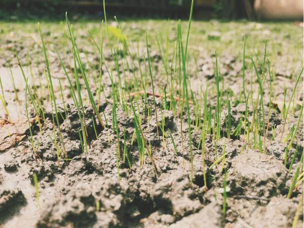 进门左侧的两块空地,原有的是红土,不适合种草籽。买来黑土,平铺一层,再撒上草种子,几天后就长出了新草。
