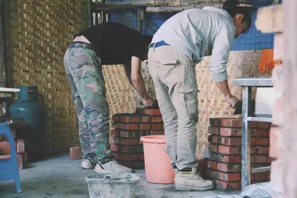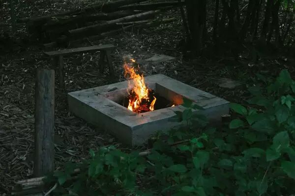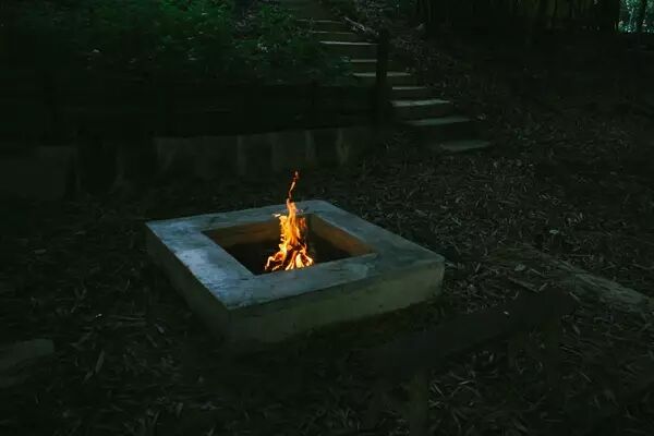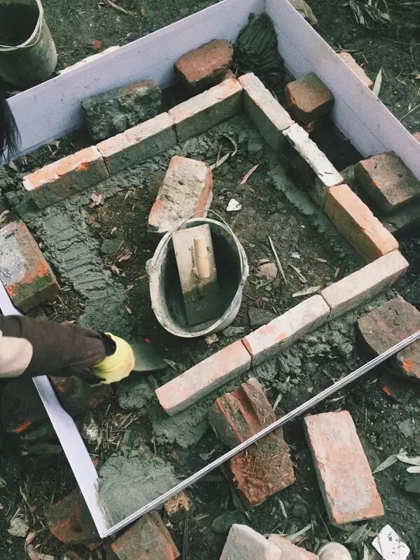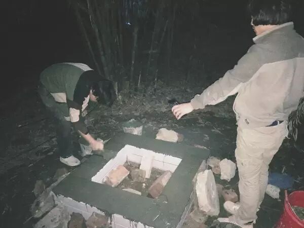 在竹林里清理出一片空地,做一个水泥篝火台。先用石板垫平地面,塑料板做成篝火台的模具,用水泥和砖块填满。我们在这里生火取暖、烤肉喝酒。
