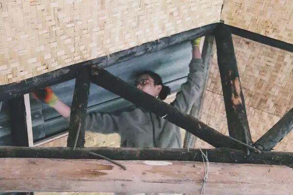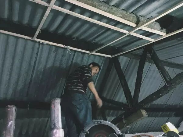 用竹节板做成高的三角吊顶。拆除塑料板,露出房梁,重新搭好木龙骨,用电锯把竹节板切割成与龙骨对应的尺寸,用码钉枪钉固定。