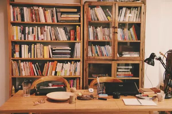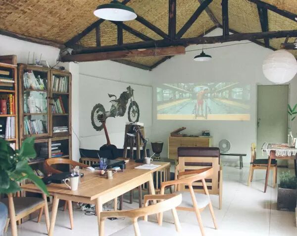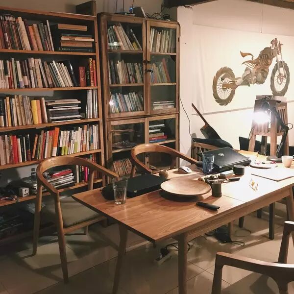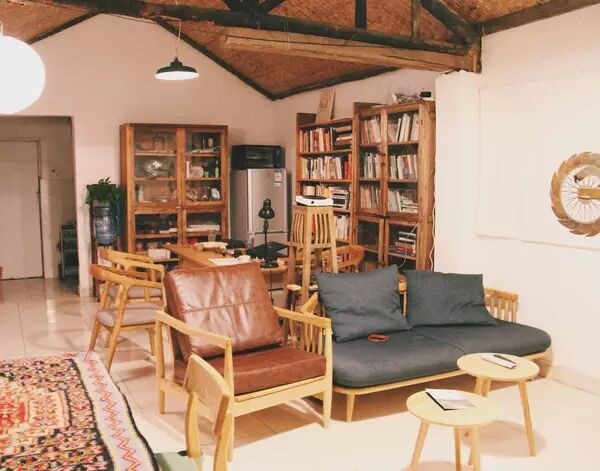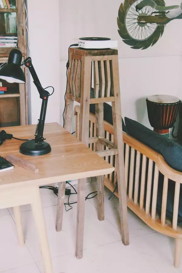 从二手市场淘来木质老书柜,装满我们的书;从淘宝买来老式工厂灯;摆放好朋友赞助的木质家具。