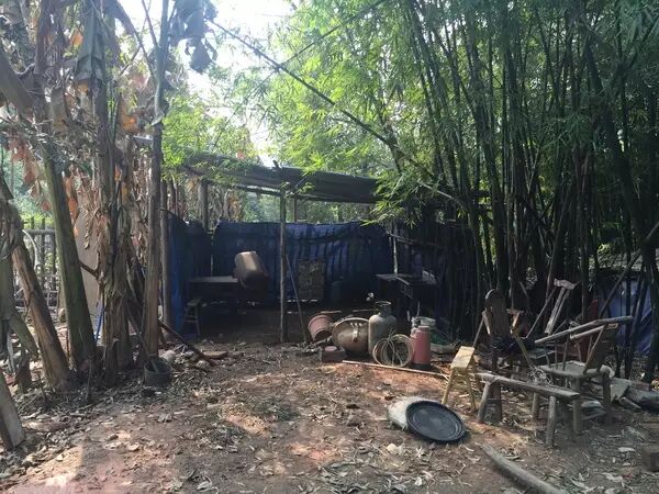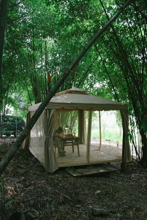 竹林中的木工棚,小明战斗的地方。用砖砌好平台,保证高度的水平,搭上钉好的防腐木板,支起帐篷。